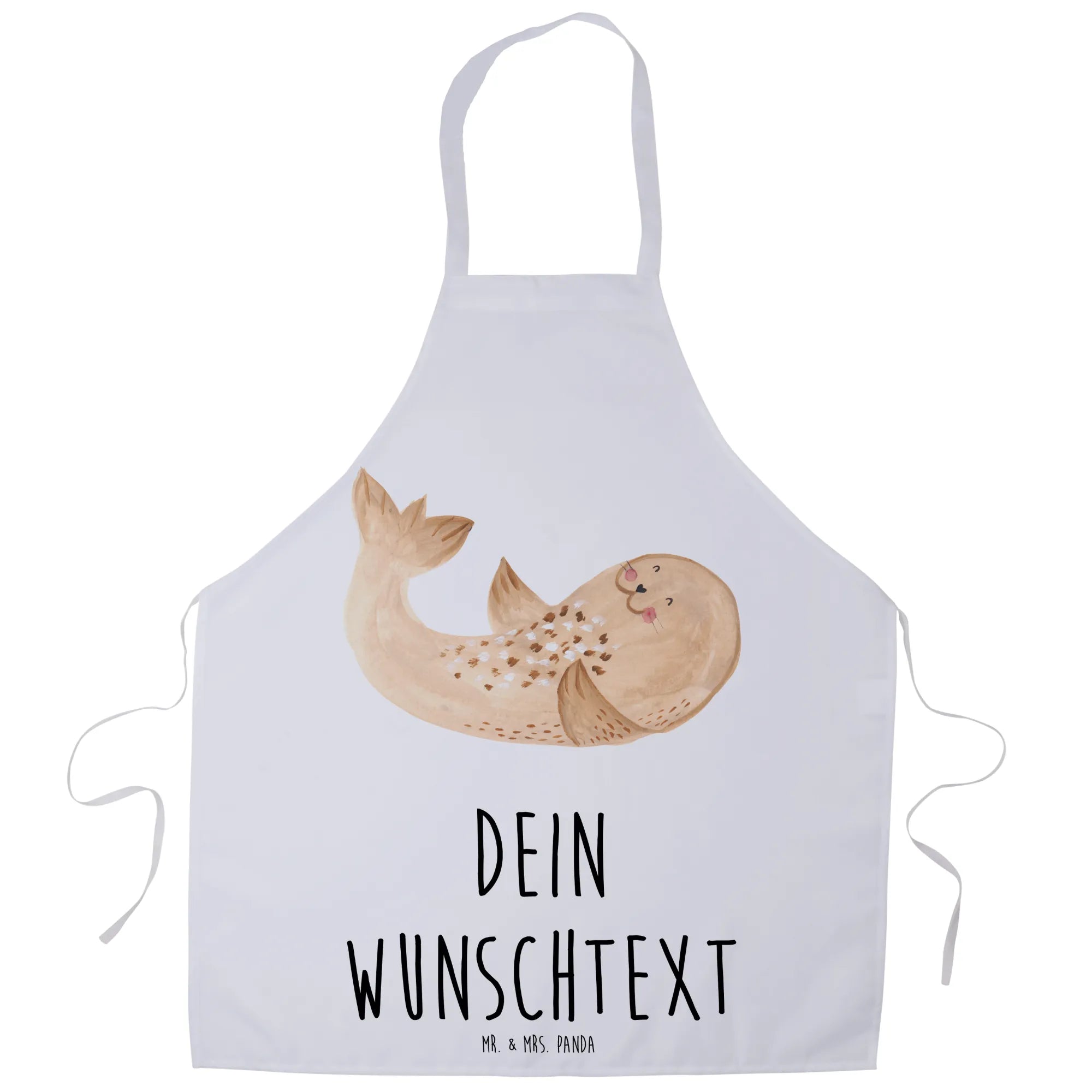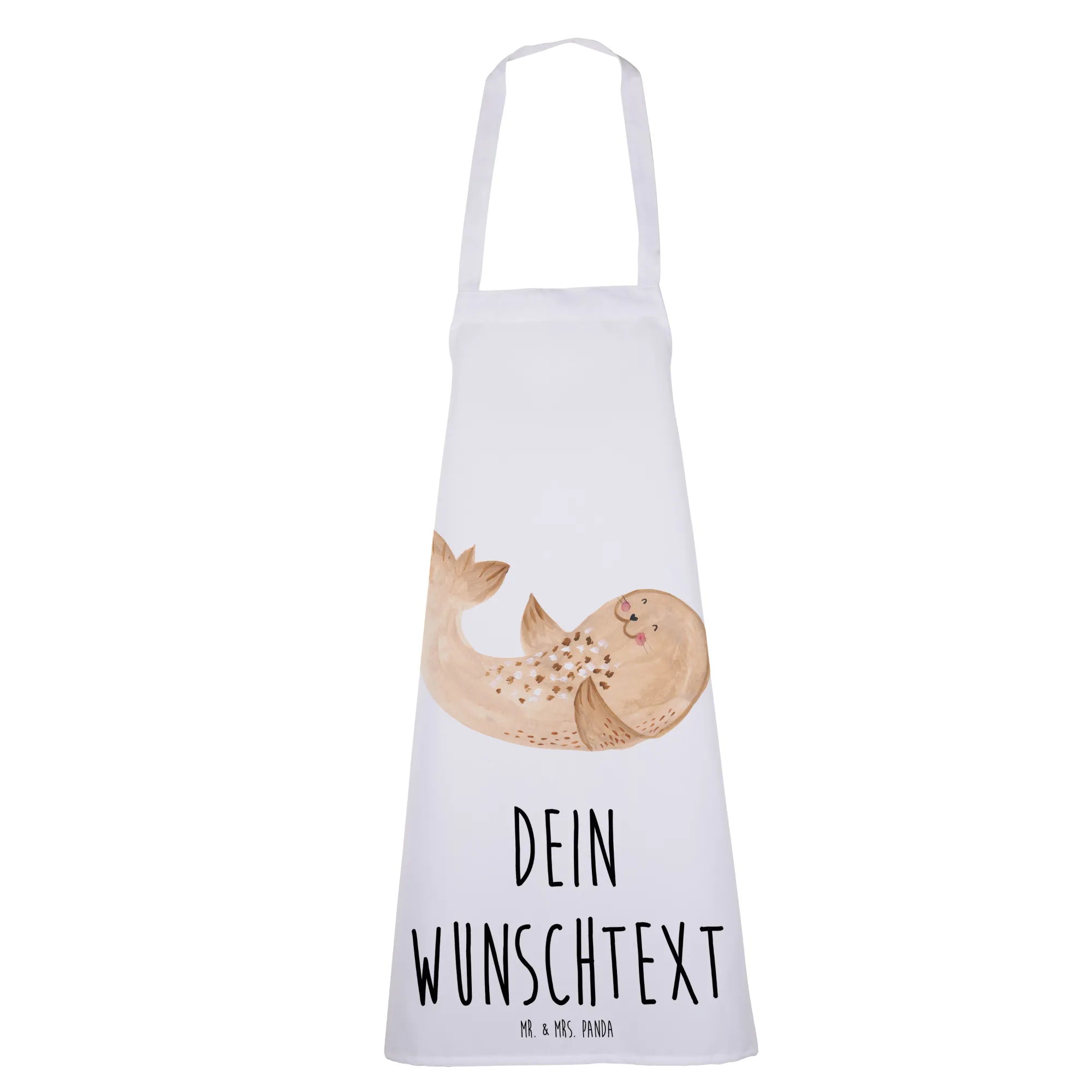 Du kannst die Schürze ganz individuell mit deinem Wunschnamen oder einem persönlichen Text bedrucken lassen. Das Motiv der gemütlichen Robbe erinnert uns daran, dass wir uns auch beim Kochen und Backen immer wieder eine Auszeit gönnen sollten.