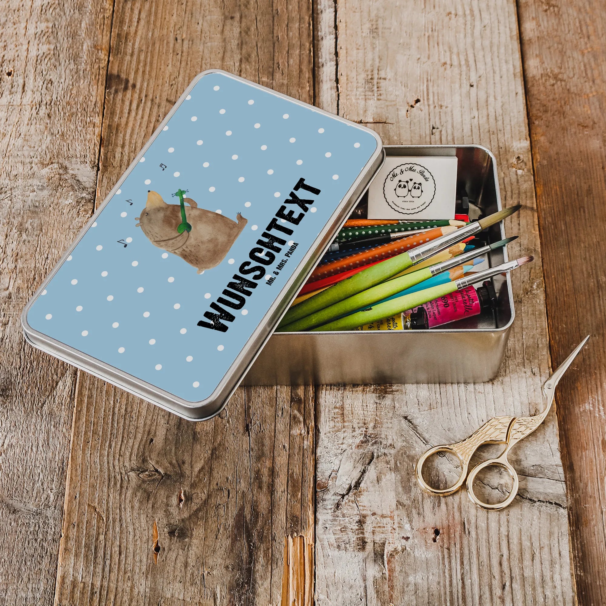 Die Kollektion von Mr. & Mrs. Panda bietet eine Vielzahl an wunderbaren Bärenmotiven, die speziell für Liebhaber der niedlichen Tiere und der Musik entworfen wurden. Jedes Motiv wurde mit viel Liebe von Mrs. Panda selbst handgezeichnet und auf hochwertiges Metall gedruckt. Diese Metalldose ist nicht nur ein wunderschönes Geschenk, sondern auch ein praktisches Aufbewahrungselement, das im Alltag Freude bereitet.