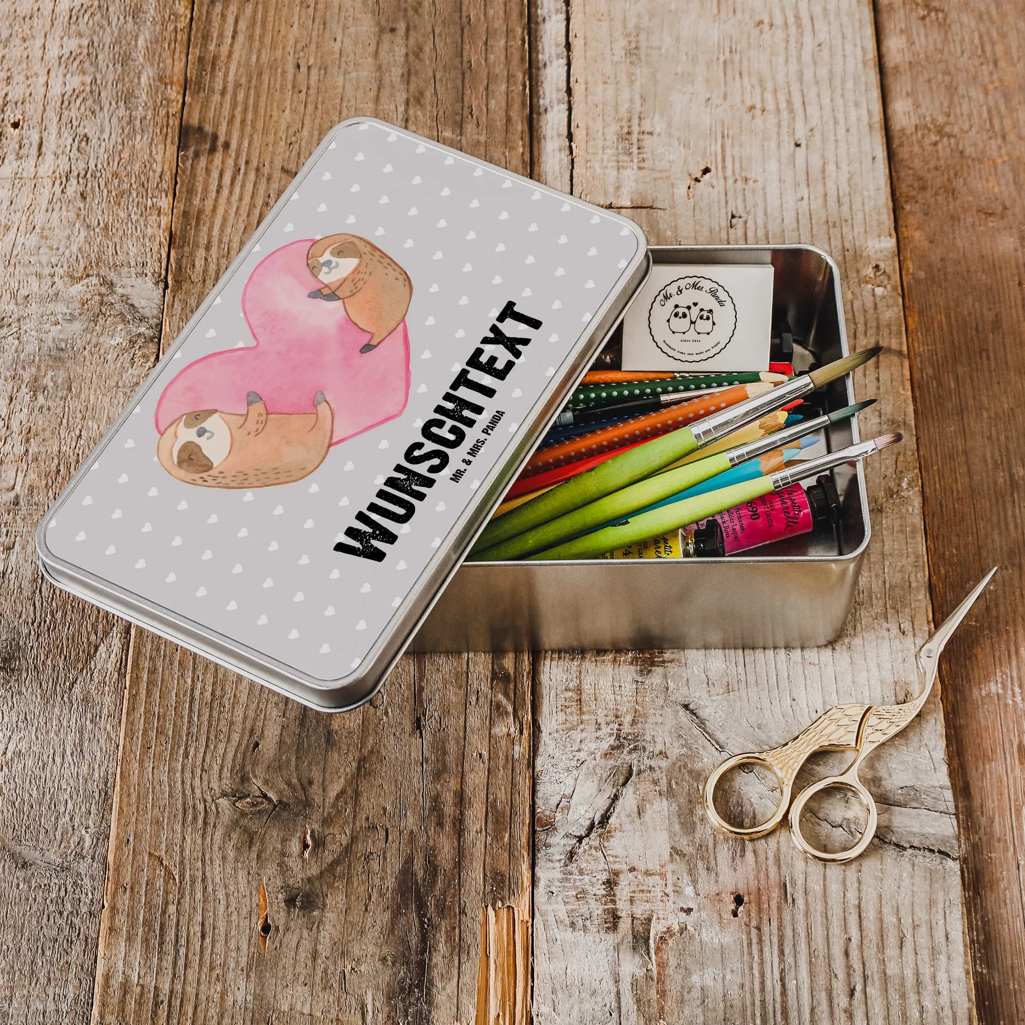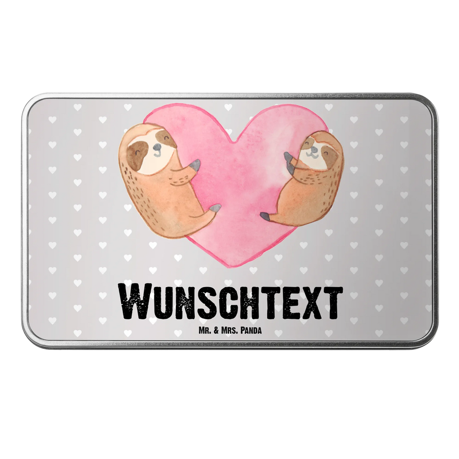 Die personalisierte Metalldose mit dem liebevollen Motiv der Faultiere Herz von Mr. & Mrs. Panda ist das perfekte Geschenk für alle, die das Besondere suchen. Diese wunderschöne Dose, personalisierbar mit deinem Wunschnamen, ist nicht nur ein Hingucker, sondern auch eine tolle Möglichkeit, um Erinnerungen oder Leckereien stilvoll aufzubewahren.