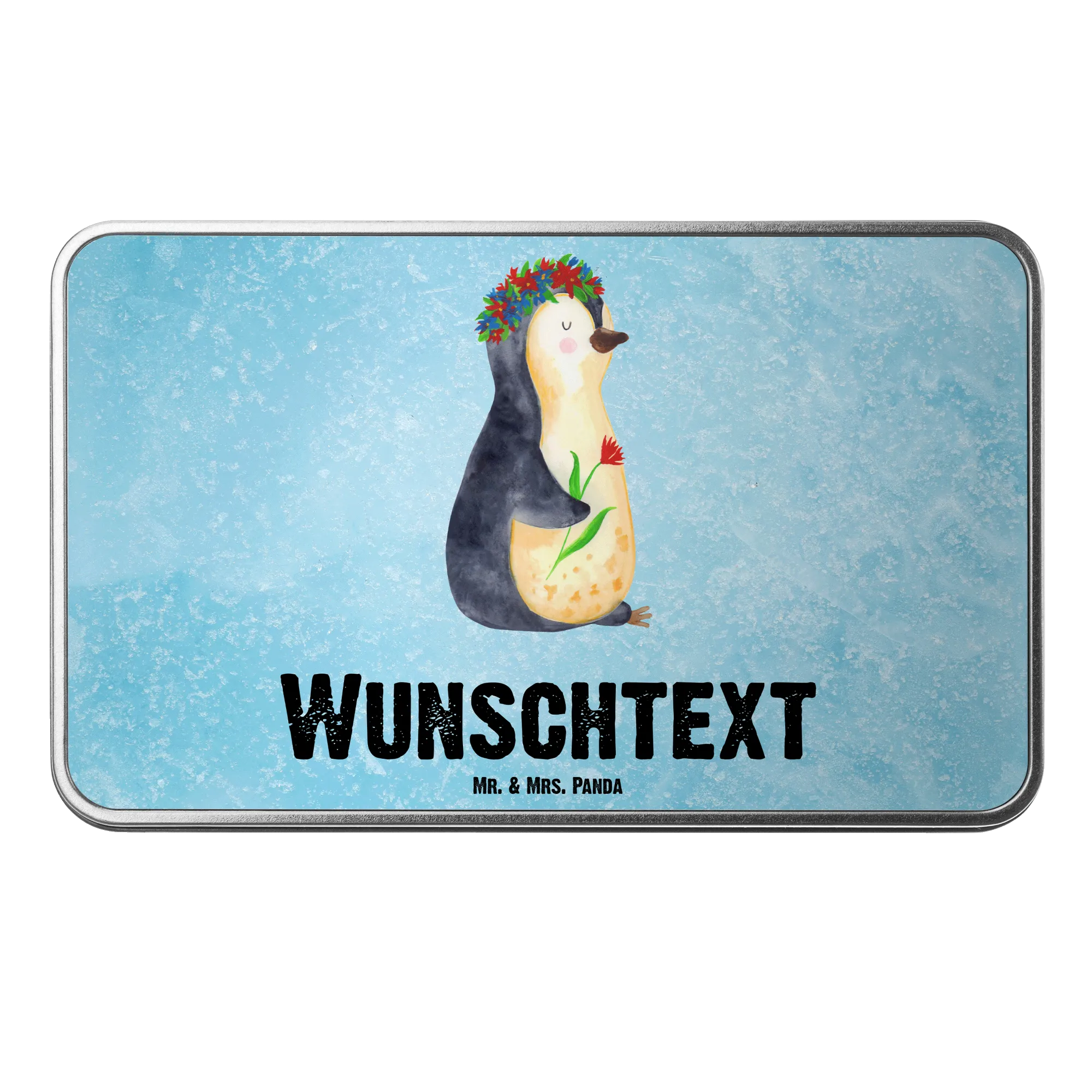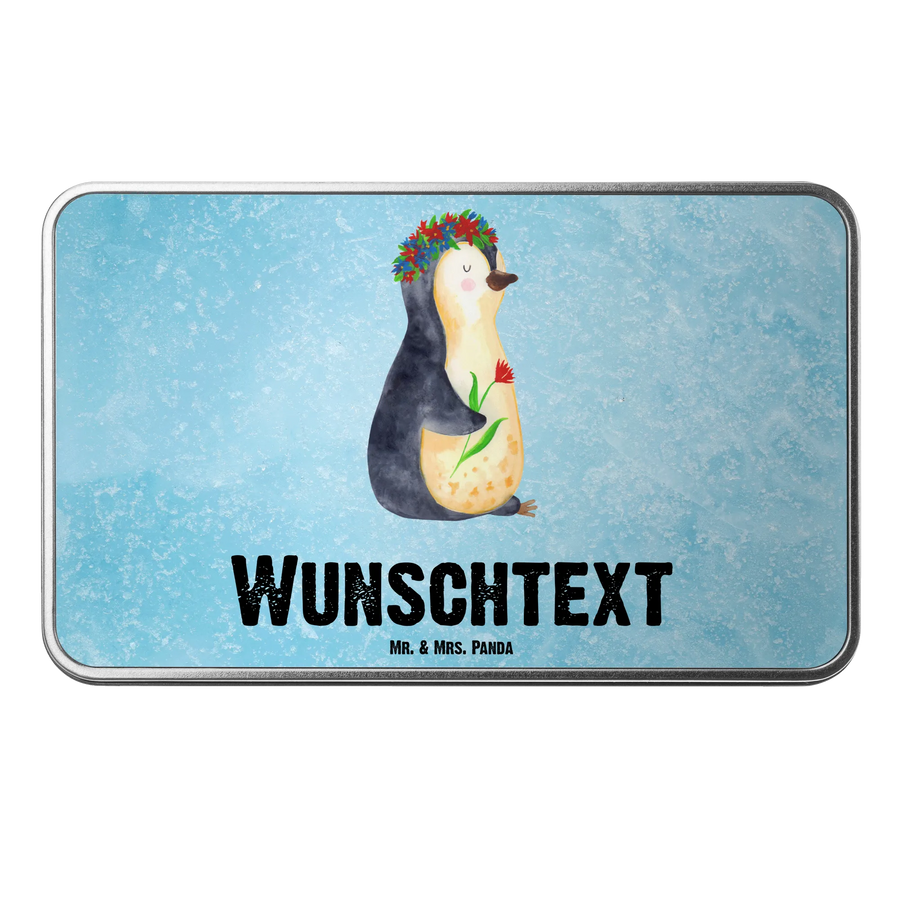 Personalisierte Metalldose Pinguin Blumenkranz