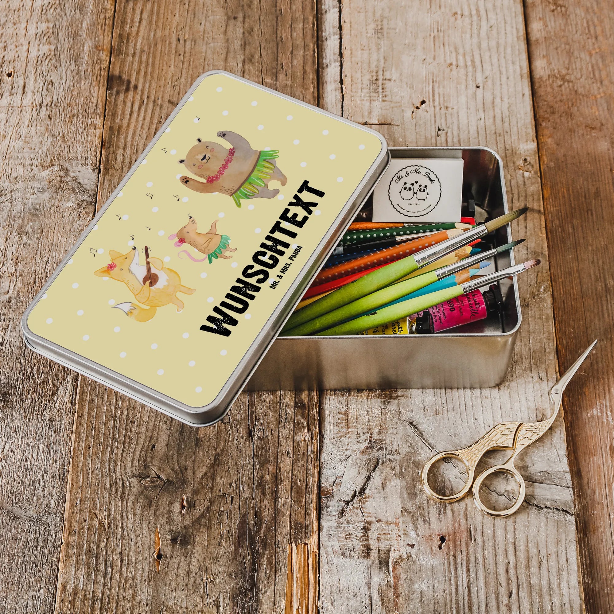 Mach dein Leben bunter mit der personalisierten Metalldose von Mr. & Mrs. Panda! Diese Rechteckdose hat die Maße von 198 mm x 128 mm x 50 mm und ein Gewicht von 180 g und ist aus hochwertigem Metall gefertigt. Sie ist stabil und langlebig und bietet dir viel Platz für Kekse oder Erinnerungen. Die bezaubernden Motive und Sprüche sind ein echter Hingucker und lassen sich mit deinem persönlichen Wunschtext oder Namen individuell gestalten. Ob als Geschenk oder zur eigenen Nutzung – die Dose eignet sich perfekt, um alles Wichtige ordentlich aufzubewahren. Ihre glänzende Oberfläche macht sie zu etwas ganz Besonderem. Bitte spüle die Dose von Hand, um ihre Schönheit zu bewahren.