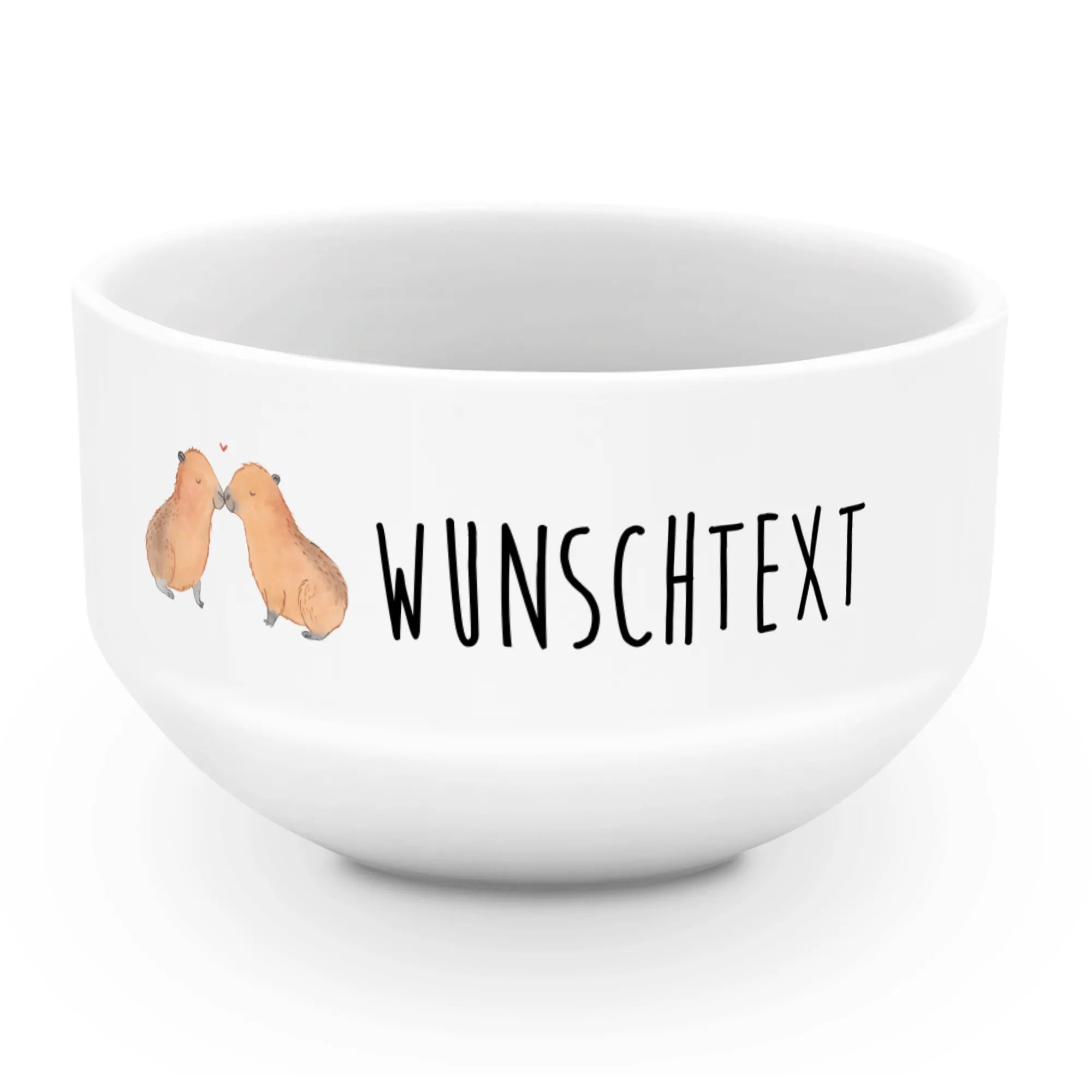 Suchst Du ein romantisches, persönliches Geschenk? Unsere Personalisierte Müslischale „Capybara Liebe“ aus der Small World Kollektion verwandelt jeden Frühstückstisch in ein kleines Liebesnest. Das handgezeichnete Motiv zeigt zwei kuschelige Capybaras, die sich sanft an der Nase berühren und gemeinsam ein herzförmiges Muster bilden. Über ihnen schwebt ein kleines, rotes Herz – eine zärtliche Illustration von Mrs. Panda mit viel Liebe zum Detail. 💕