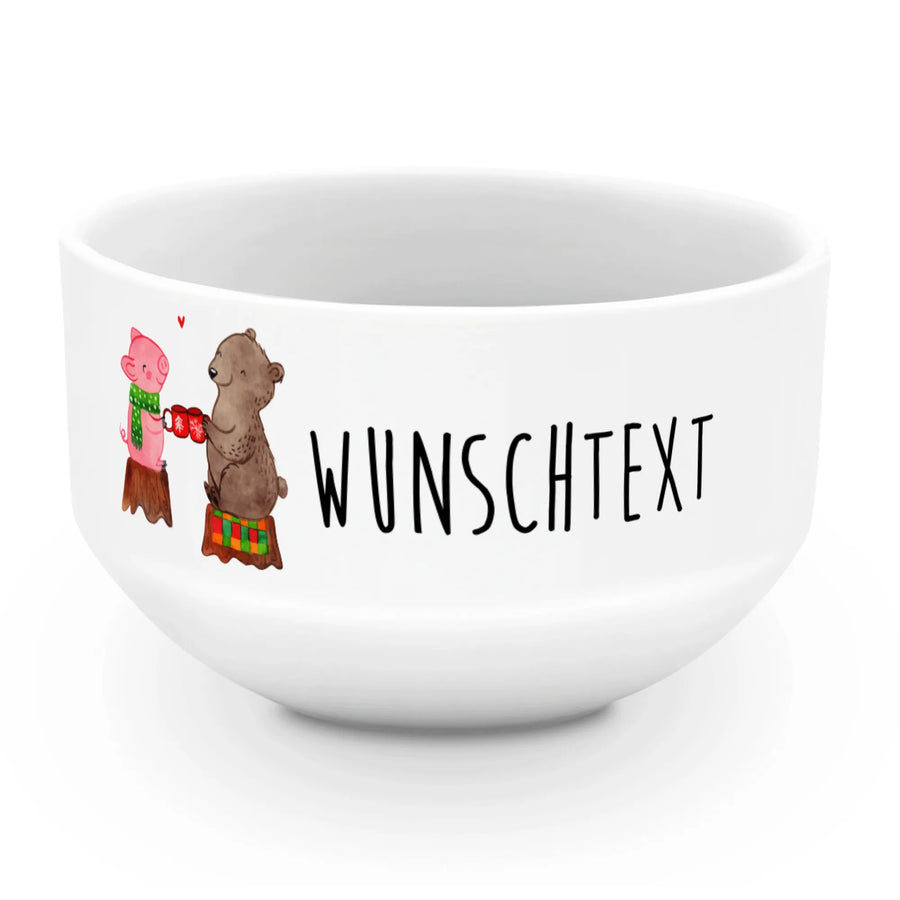 Die personalisierte Müslischale Glühschwein Sause aus der Winter Kollektion von Mr. & Mrs. Panda ist das perfekte Geschenk für alle, die die besinnliche Jahreszeit lieben! Möchtest Du die Weihnachtszeit auf eine besondere Art und Weise feiern? Diese liebevoll gestaltete Schüssel bringt Freude und Wärme in jedes Frühstück. Mit einem charmanten Motiv, das ein Bär und ein niedliches Schweinchen zeigt, die gemeinsam mit einer Tasse anstoßen, verbreitet sie eine festliche Atmosphäre. Der Slogan 'Ein Prosit auf das feine Leben!' ergänzt die liebevolle Darstellung und lädt zum Anstoßen ein.