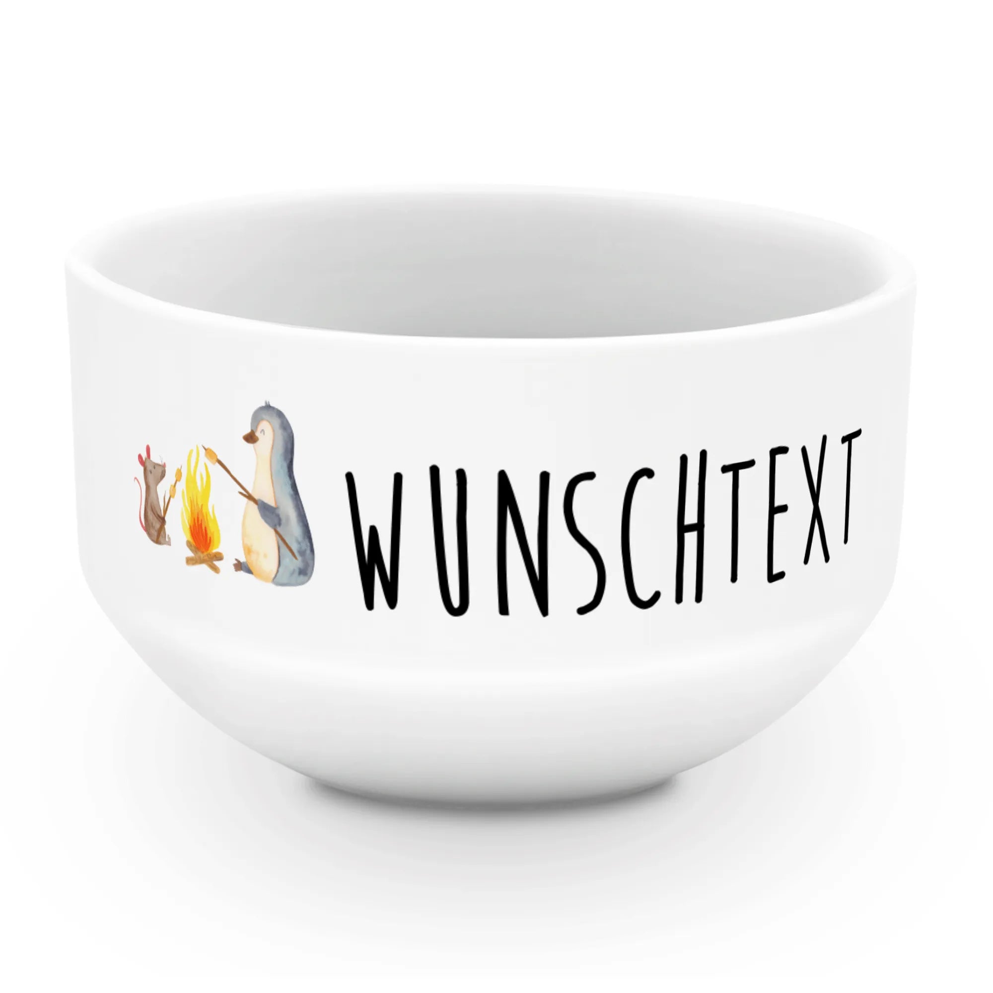 Personalisierte Müslischale Pinguin Lagerfeuer