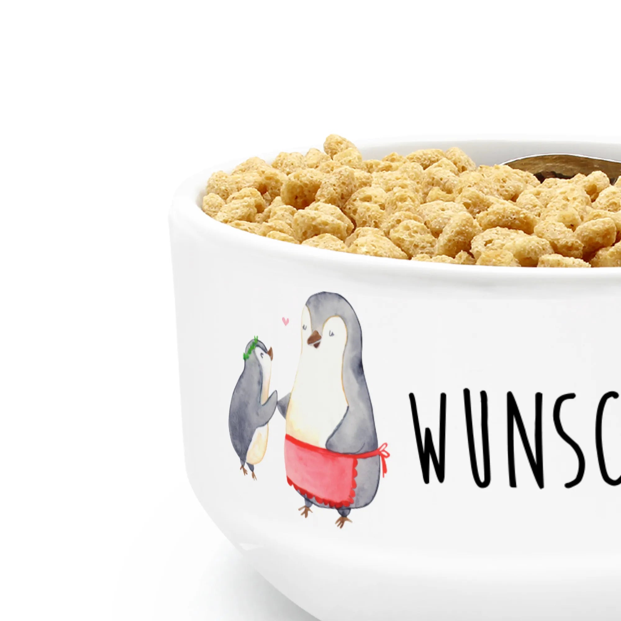 Entdecke die perfekte Mischung aus Stil und Liebe mit unserer personalisierten Müslischale "Pinguin mit Kind" aus der bezaubernden Familie-Kollektion von Mr. & Mrs. Panda. Diese schöne Keramik Schüssel ist so viel mehr als nur ein Essgeschirr; sie ist ein Ausdruck von Verbundenheit für alle besonderen Mamas da draußen. Stell dir vor, wie die Mama und das Kind in einem verspielten Moment vereint sind – der große Pinguin in einer roten Schürze, der fürsorglich auf seinen kleinen Pinguin schaut, der einen grünen Kranz trägt. Das schwebende Herz zwischen ihnen symbolisiert die Liebe, die jede Familie ausmacht.