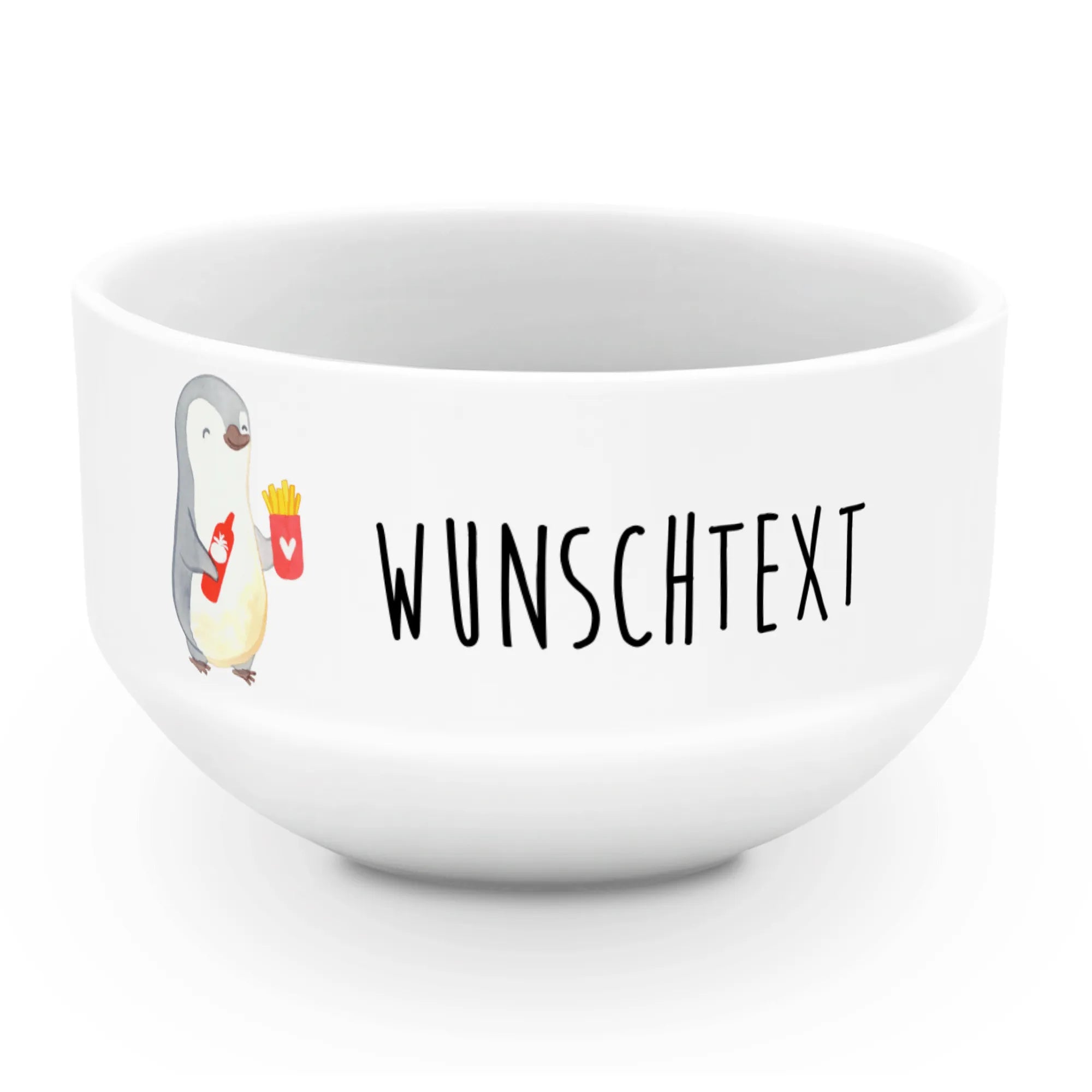 Die personalisierte Müslischale mit dem fröhlichen Pinguin-Motiv "Pommes" aus der Kollektion Liebe von Mr. & Mrs. Panda ist das perfekte Geschenk für deine Liebsten! Egal ob zum Valentinstag, Jahrestag oder einfach nur so - diese bezaubernde Schüssel bringt nicht nur Freude beim Frühstück, sondern sorgt auch für ein Lächeln im Alltag. Die Schale ist aus hochwertigem Porzellan gefertigt und begeistert mit einem brillanten, glänzenden Aufdruck, der garantiert lange hält.