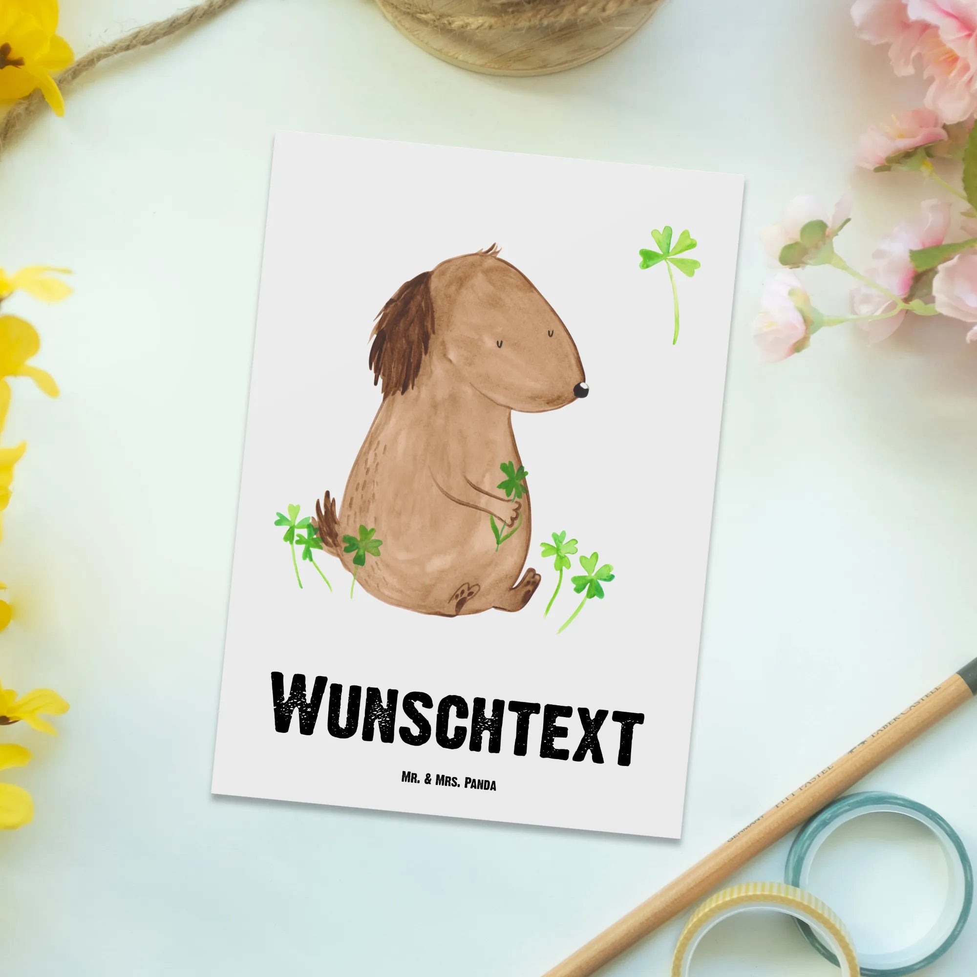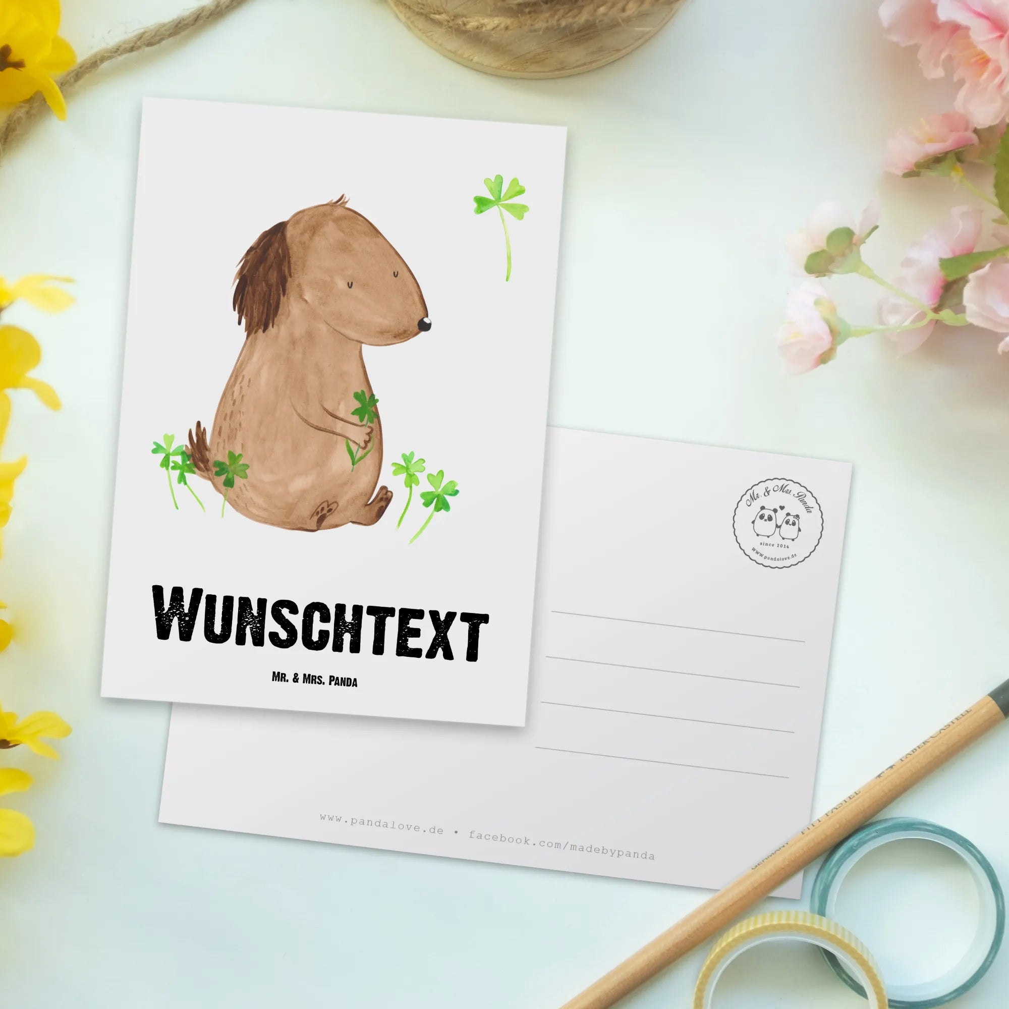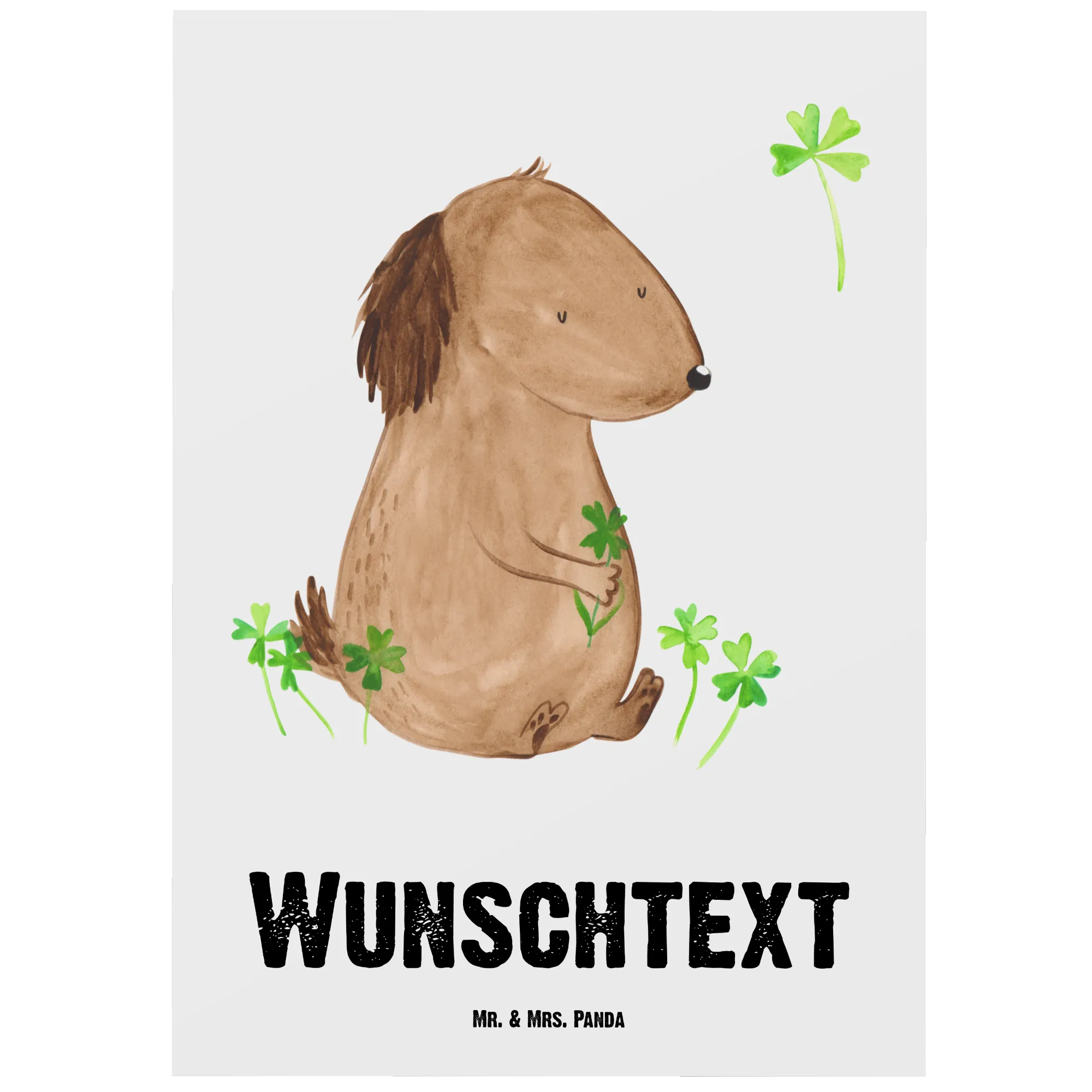 Egal ob zum Geburtstag, zur Hochzeit oder einfach nur so – diese Karte mit deinem Wunschnamen und Wunschtext hat die Kraft, Glücksmomente zu versprühen. Der süße Hund, der ein Kleeblatt in der Hand hält, symbolisiert die besonderen Dinge im Leben, die man nicht kaufen kann – wie die Liebe zu unseren vierbeinigen Freunden.