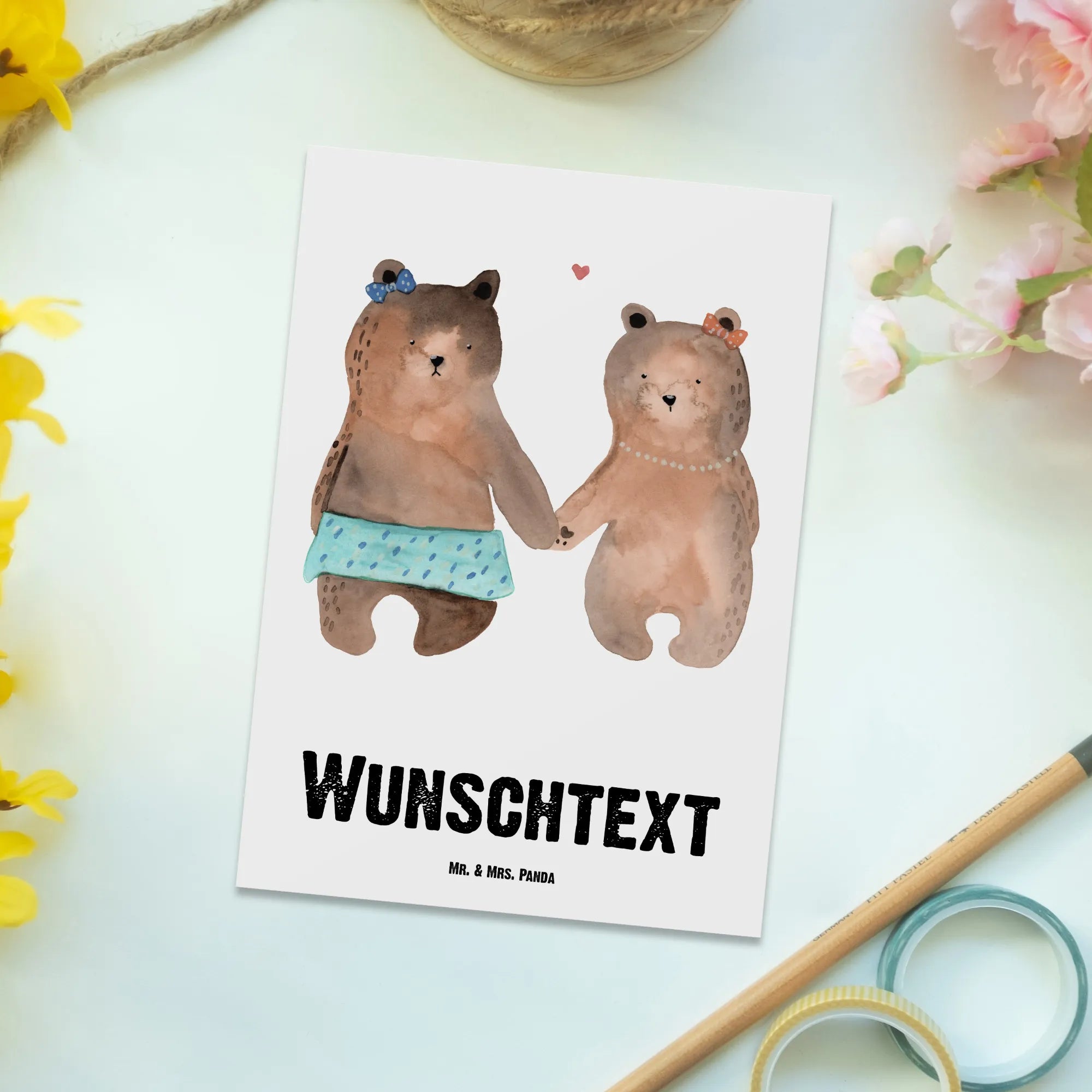 Bär Freundin von Mr. & Mrs. Panda ist die perfekte personalisierte Postkarte, um deinen Freunden zu zeigen, wie viel sie dir bedeuten. Die beiden süßen Bärenmädchen, die sich an den Händen halten, strahlen eine unvergängliche Freundschaft aus. Mit der Aufschrift "Du bist für immer meine beste Freundin" auf der Vorderseite wird deine Wertschätzung für deine beste Freundin auf besonders persönliche Weise deutlich. Dieses wunderbare Motiv erinnert jeden Betrachter daran, wie wichtig Freundschaft ist und zaubert ein Lächeln ins Gesicht.