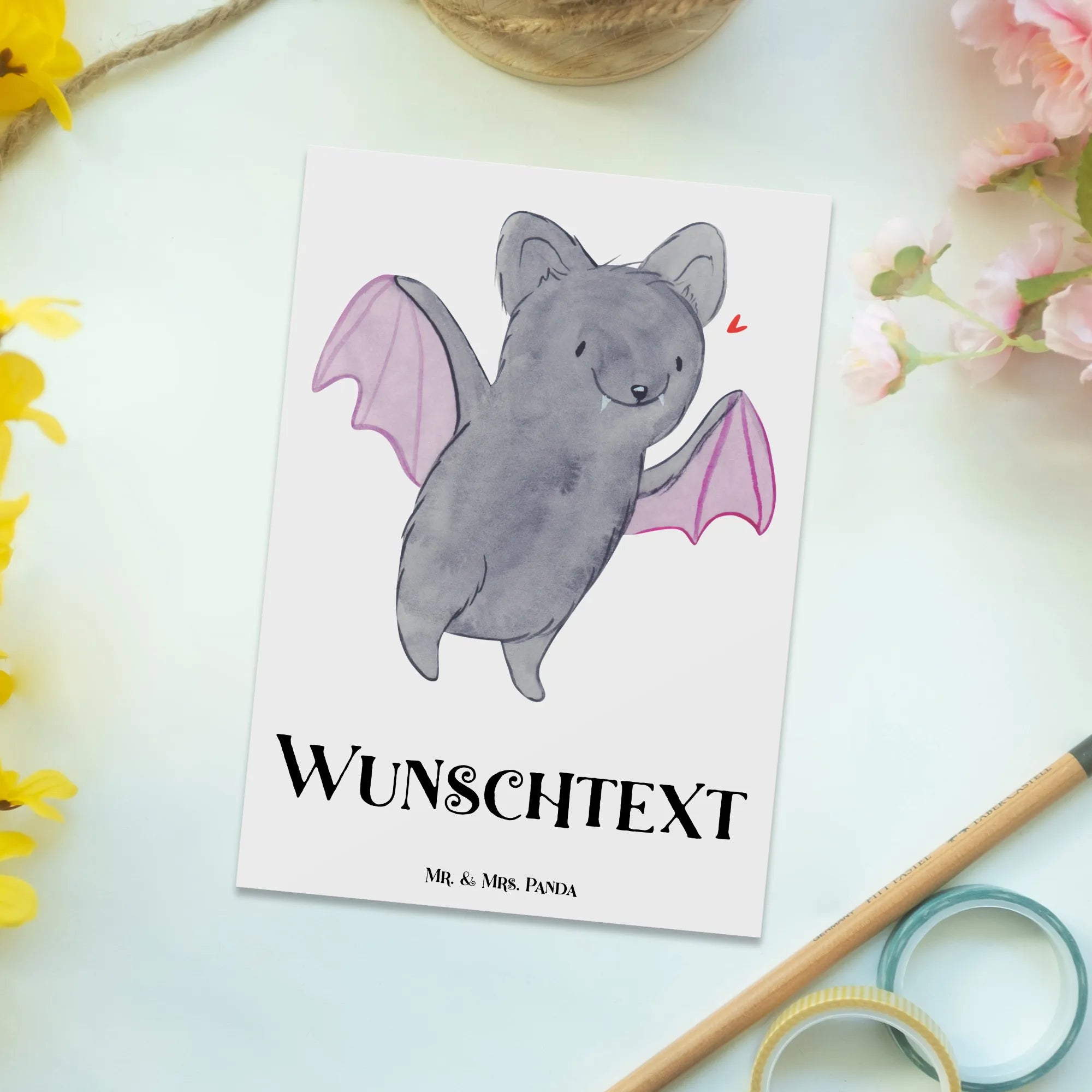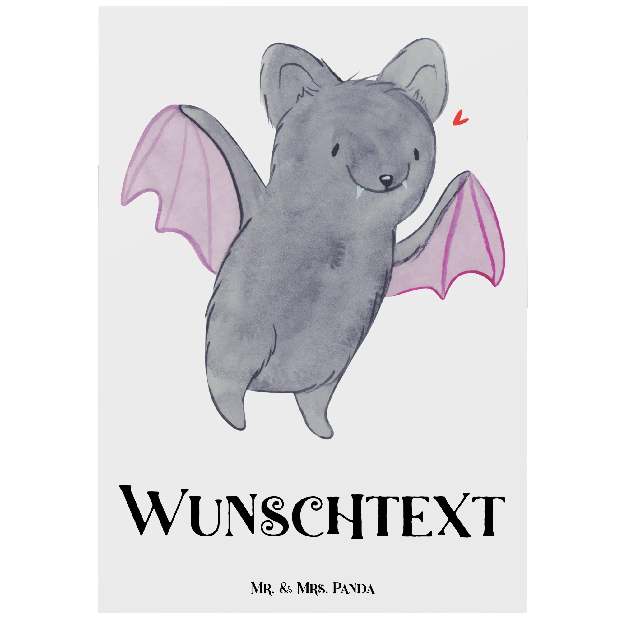 Die personalisierte Postkarte mit dem Motiv "Fledermaus Erschrecken" aus der Halloween-Kollektion von Mr. & Mrs. Panda ist das ideale Geschenk für alle, die die spooky Jahreszeit lieben. Diese zauberhafte Karte ist individuell bedruckt und sorgt mit ihrem einzigartigen Design für unvergessliche Überraschungsmomente. Die Fledermaus, die auf der Karte zu sehen ist, lächelt freundlich mit kleinen Fangzähnen und hat sanft rosa Flügel – ein echter Blickfang für jeden Halloween-Fan.