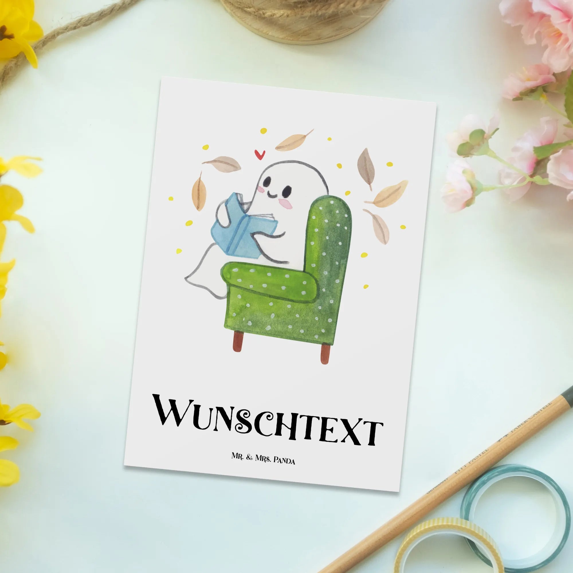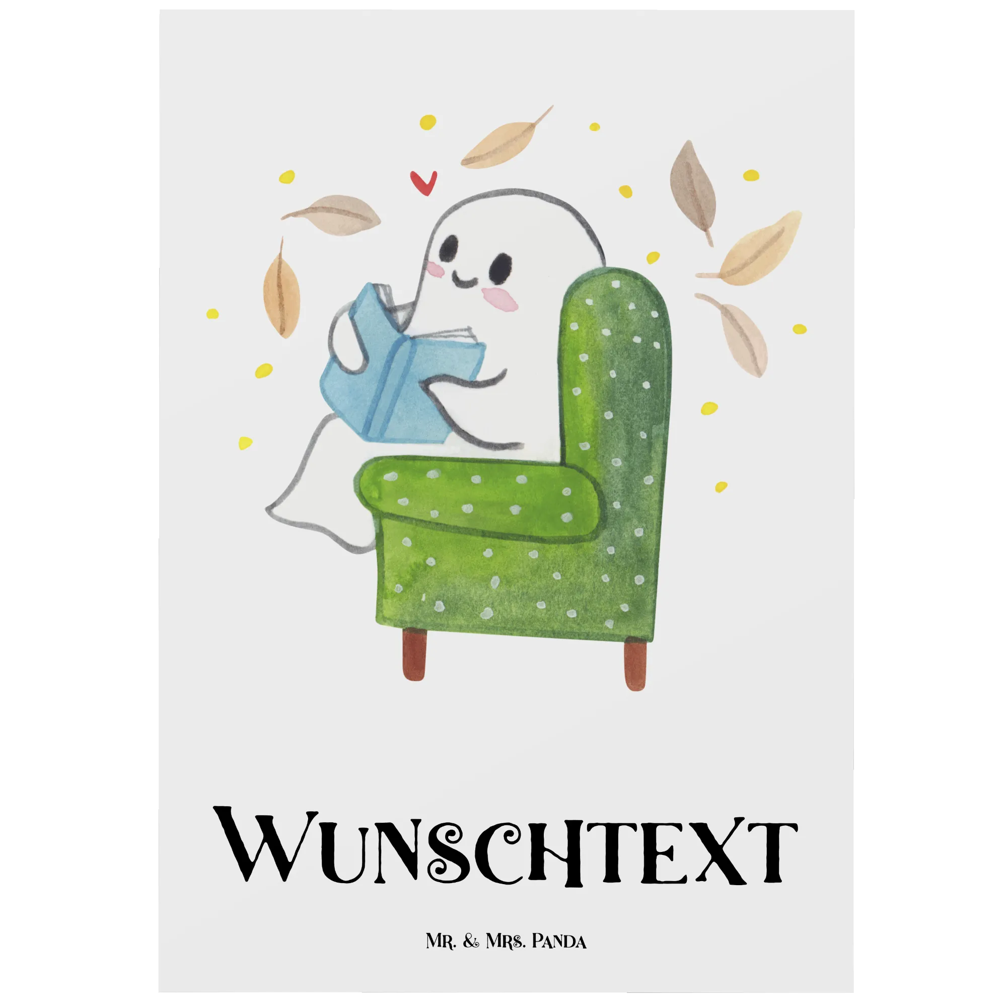 Bist du bereit für einen kuscheligen Herbstabend? Mit unserer personalisierten Postkarte 'Gespenst mit Buch' aus der Halloween-Kollektion von Mr. & Mrs. Panda holst du ein Stück gemütliche Atmosphäre direkt zu dir nach Hause! Diese einzigartige Postkarte ist perfekt gestaltet, um Liebe und Freude zu versprühen. Das niedliche Gespenst sitzt behaglich in einem grünen Sessel und liest aufmerksam ein blaues Buch, während herbstlich gefärbte Blätter um ihn herumtanzen. Über dem Gespenst schwebt ein kleines rotes Herz – ein Symbol der Wärme und des Wohlfühlens, das jedem Herz einen Hauch von Glück vermittelt.