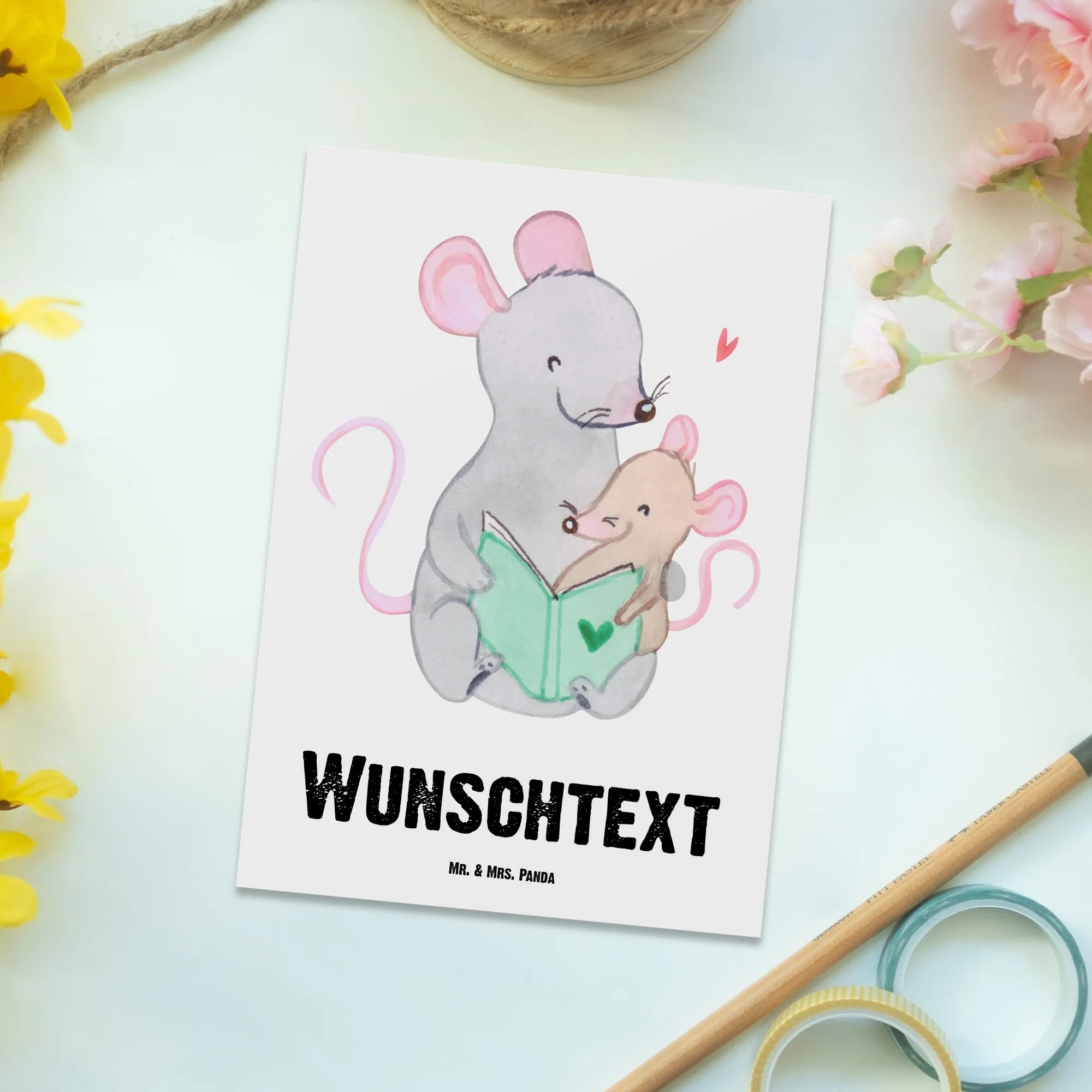 Entdecke die zauberhafte personalisierte Postkarte mit dem süßen Motiv "Maus Beste Adoptivmutter der Welt" aus der Kollektion Beziehungen von Mr. & Mrs. Panda! Diese einzigartige Grußkarte ist perfekt, um Deiner Adoptivmutter zu danken oder ihr einfach mal so eine Freude zu bereiten. Mit ihrem niedlichen Design, das eine süße Maus zeigt, die einer Kindermaus aus einem Buch vorliest, bringt diese Postkarte ein Lächeln auf jedes Gesicht.