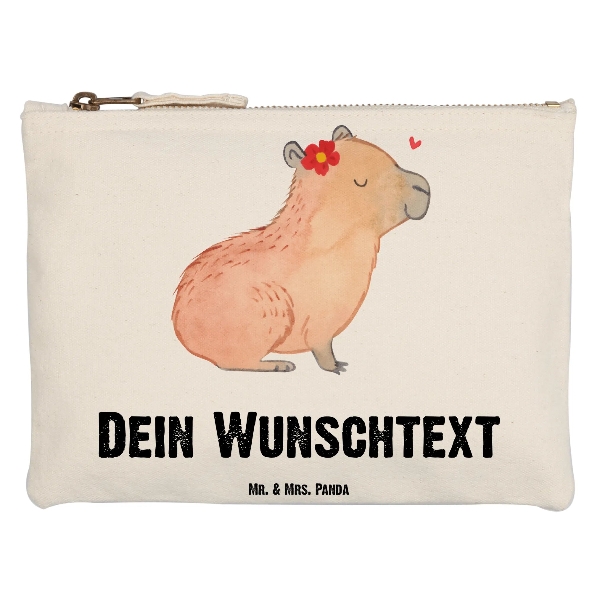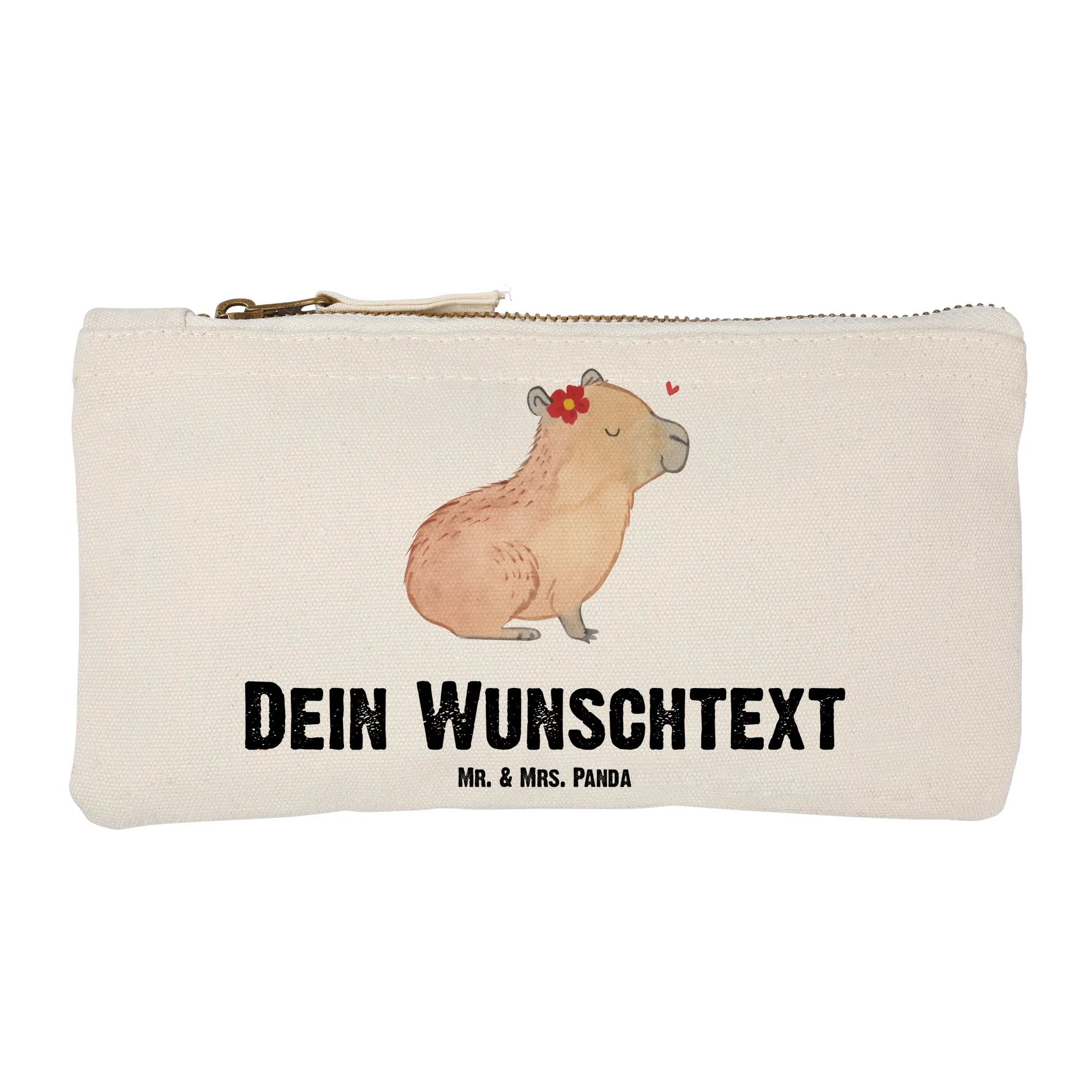 Die personalisierte Schminktasche mit dem bezaubernden Capybara Blume Motiv aus der Small World Kollektion von Mr. & Mrs. Panda ist das perfekte Geschenk für alle, die Freude an schönen, praktischen Accessoires haben.