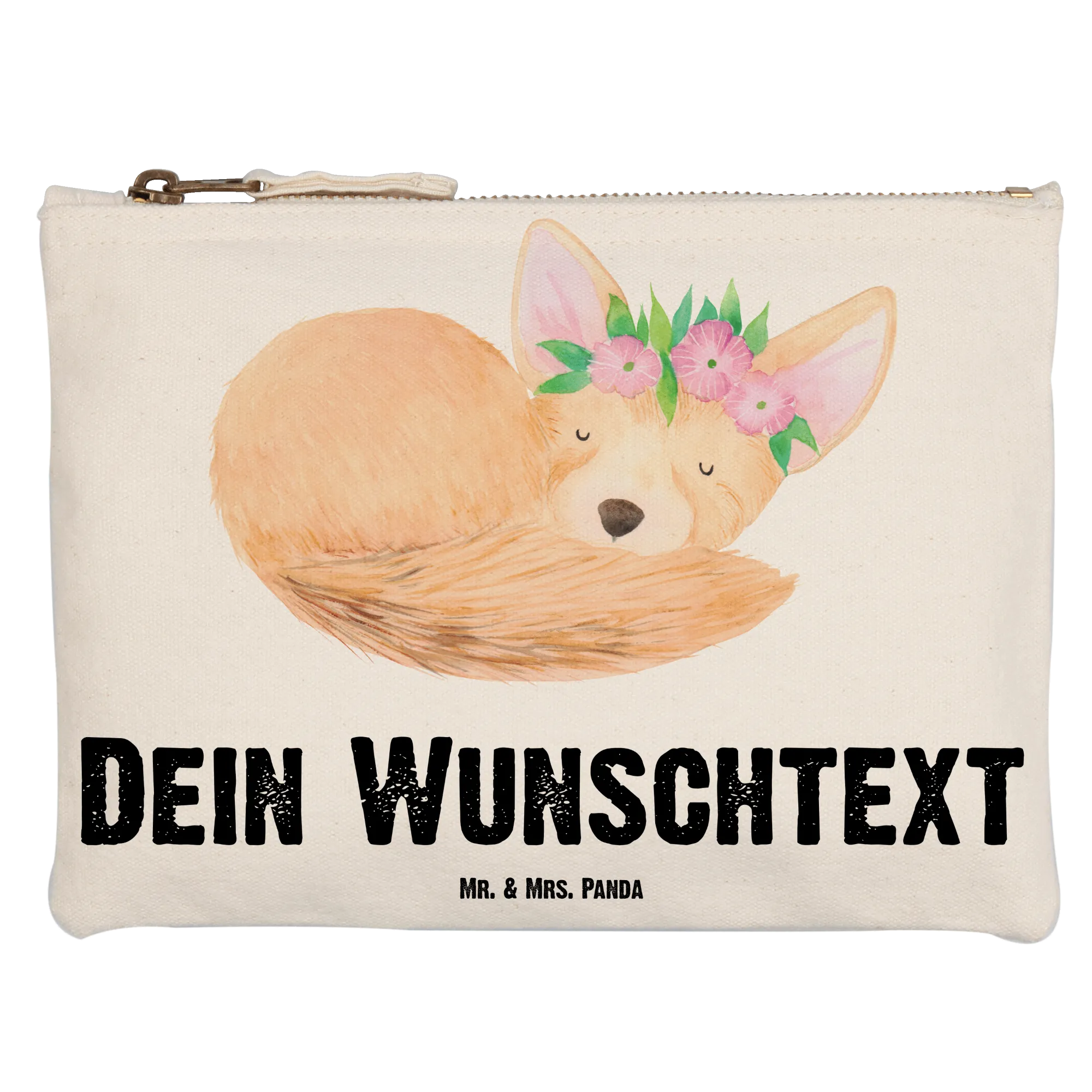 Die personalisierte Schminktasche Wüstenfuchs Blumenkranz von Mr. & Mrs. Panda ist das perfekte Accessoire für alle, die Schönheit und Individualität hoch schätzen! Diese einzigartige Kosmetiktasche bringt nicht nur Ordnung in dein Makeup, sondern sorgt auch dafür, dass du immer ein Stückchen Afrika bei dir hast.