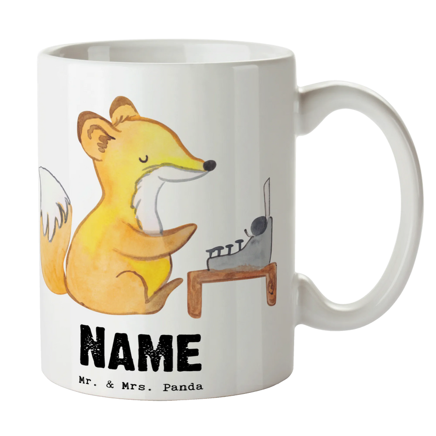 Diese wunderschöne, personalisierbare Keramiktasse bietet Platz für deinen Wunschnamen oder Wunschtext und wird mit liebevollen, handgezeichneten Motiven verziert. Mit dem süßen Fuchs, der an seiner Schreibmaschine sitzt, wirst du jeden Tag daran erinnert, wie wichtig deine Schriftstellerleidenschaft ist.