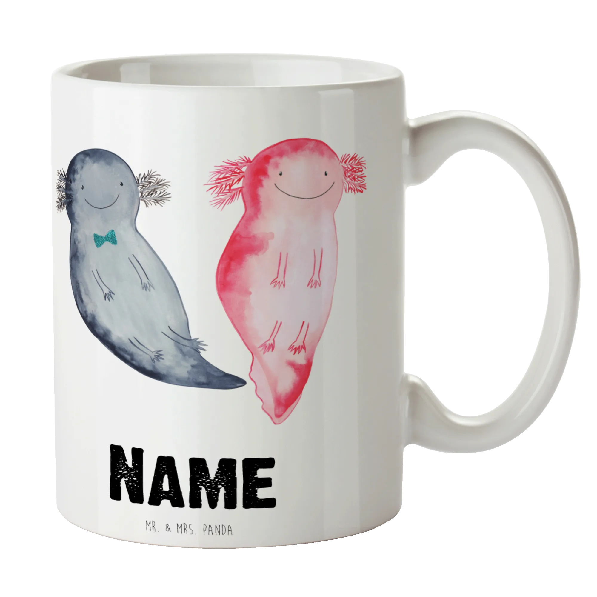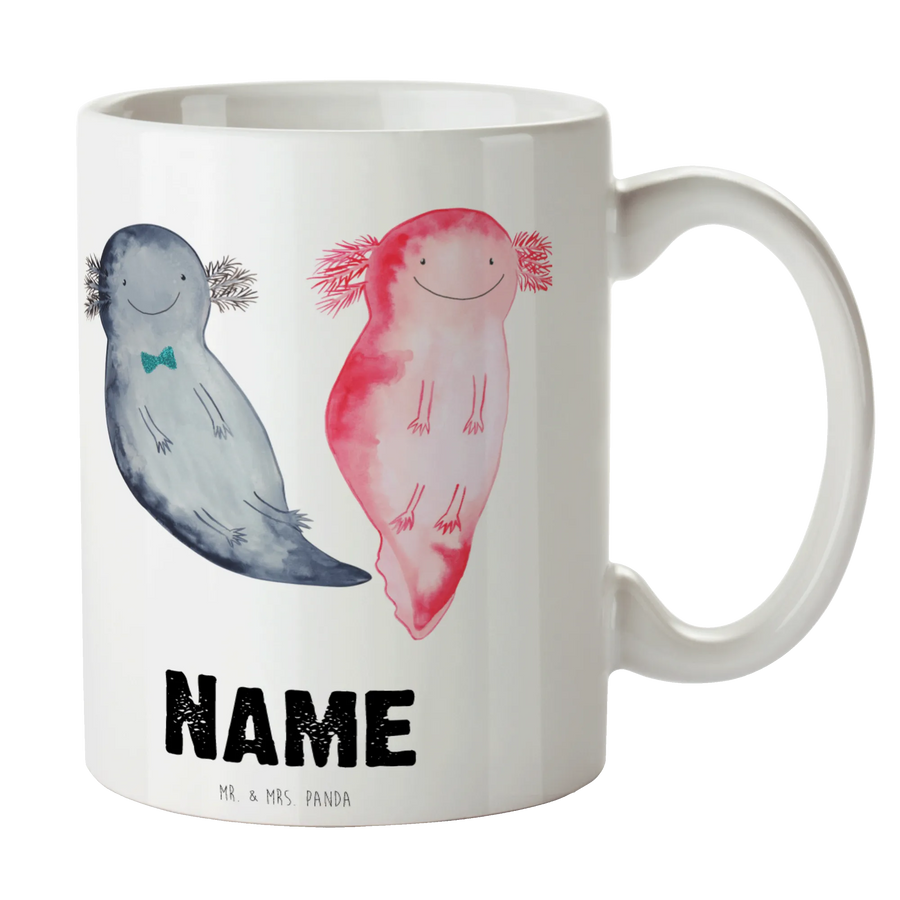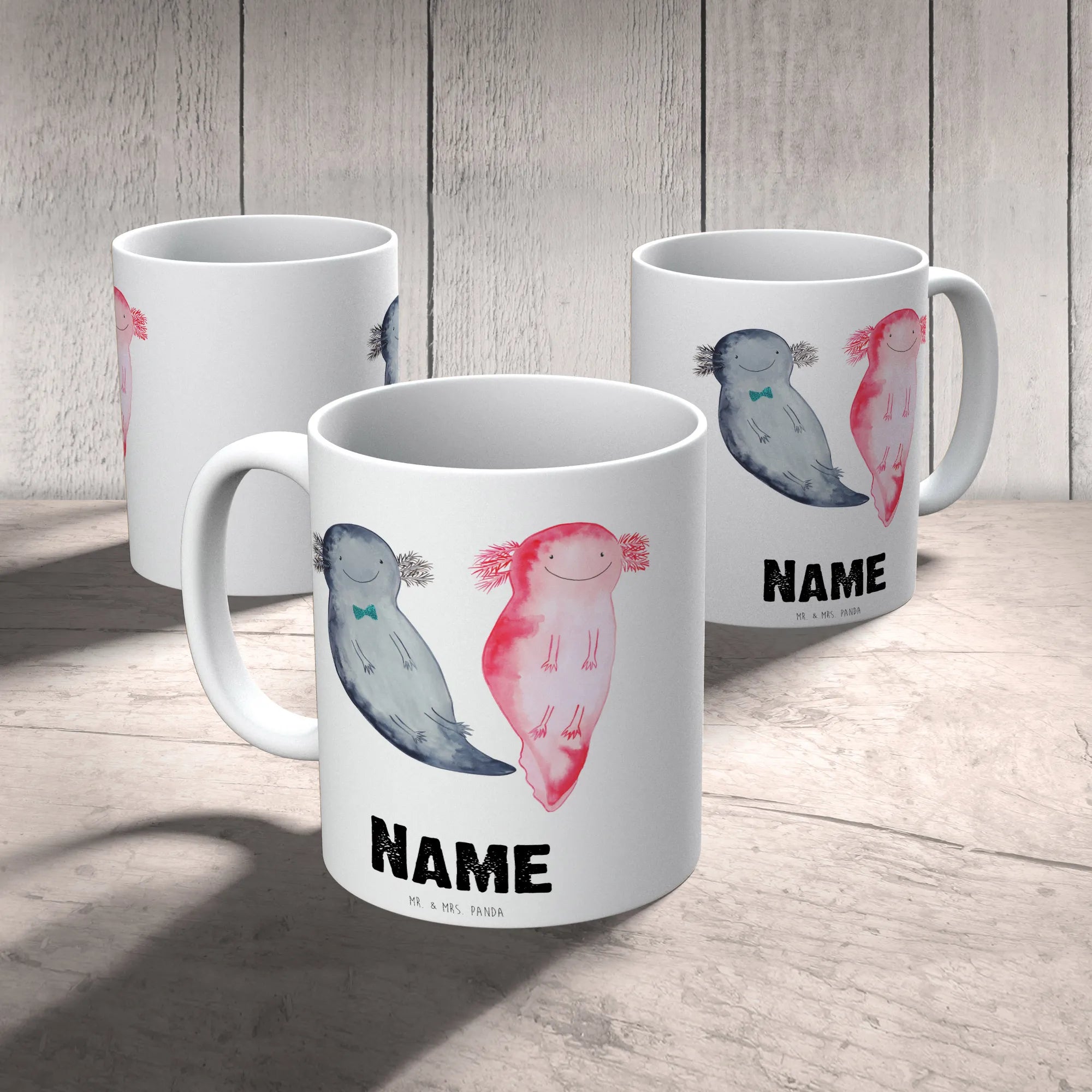 Die personalisierte Tasse Axolotl Axel+Lotte von Mr. & Mrs. Panda ist das perfekte Geschenk für alle, die das Besondere lieben! Diese wunderschöne, spülmaschinenfeste Keramiktasse kommt mit einem süßen Motiv zweier Axolotl, die Seite an Seite schwimmen und in zarten Pastelltönen erstrahlen.