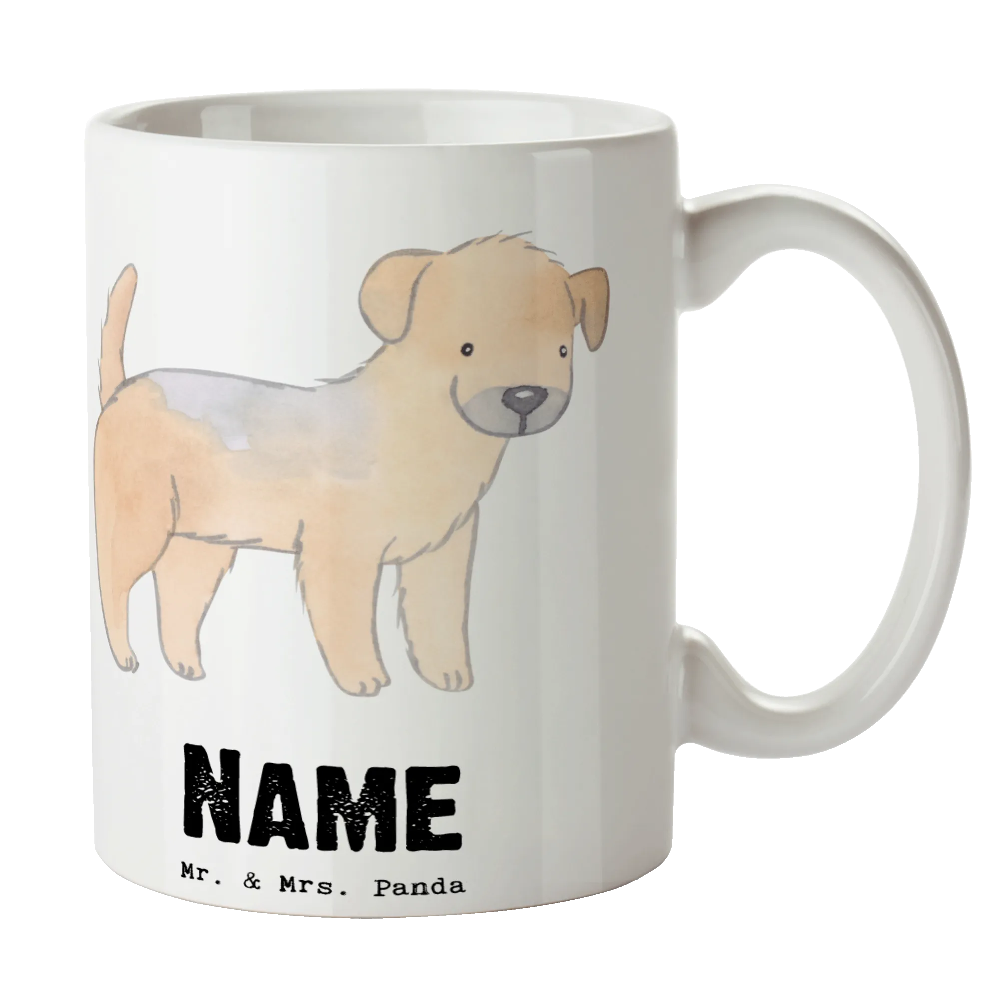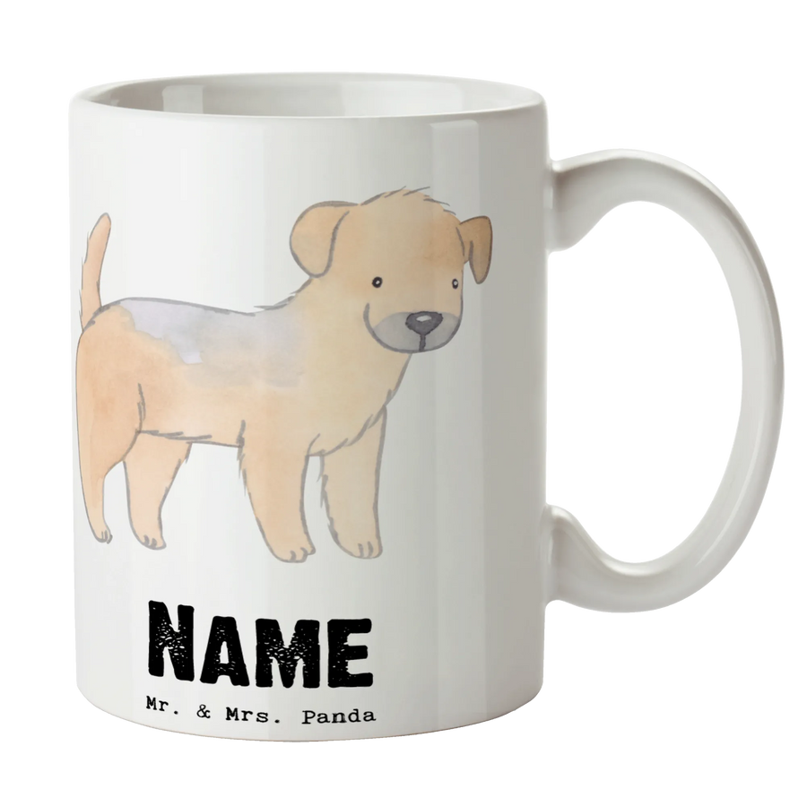Die personalisierte Tasse mit dem Motiv Border Terrier Lebensretter von Mr. & Mrs. Panda ist das perfekte Geschenk für alle Hundeliebhaber! Sie zeigt einen freundlichen Border Terrier in sanften aquarellierten Tönen und hat den liebevollen Spruch "Mein Lebensretter ist ein Border Terrier". Diese wunderschöne Keramiktasse hat eine Füllmenge von 300 ml, ideal für Deinen morgendlichen Kaffee oder Tee.