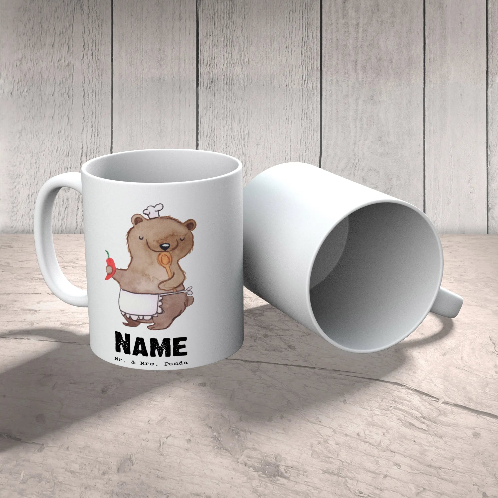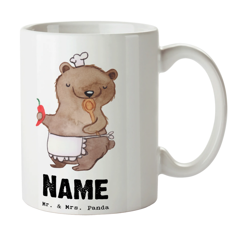 Jede Tasse wird individuell mit Deinem Wunschnamen bedruckt, sodass sie ein absolut persönliches Geschenk wird. Das zuckersüße Motiv zeigt einen Bären mit einer Kochmütze, der mit einer Chili und einem Kochlöffel in der Hand fröhlich in der Küche tätig ist. Es passt perfekt zu jedem Koch, ob professionell oder hobbymäßig.