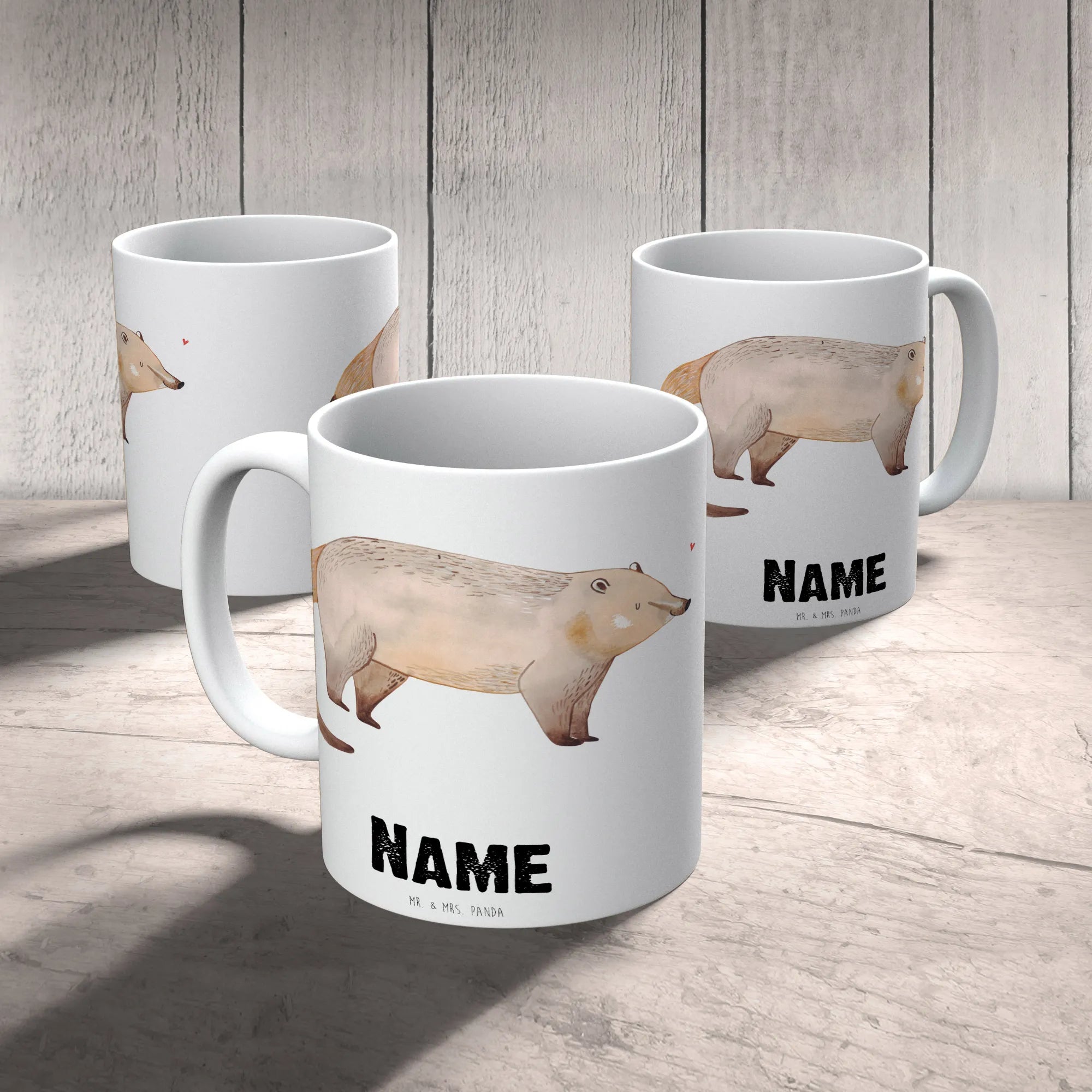 Entdecke die perfekte personalisierte Tasse mit dem süßen Nasenbär-Motiv aus der Small World Kollektion von Mr. & Mrs. Panda! Diese wunderschöne Keramiktasse ist nicht nur ein echter Hingucker, sondern auch ein ganz persönliches Geschenk. Du kannst sie mit deinem Wunschnamen oder Wunschtext gestalten, was sie zu einem einzigartigen Begleiter macht.