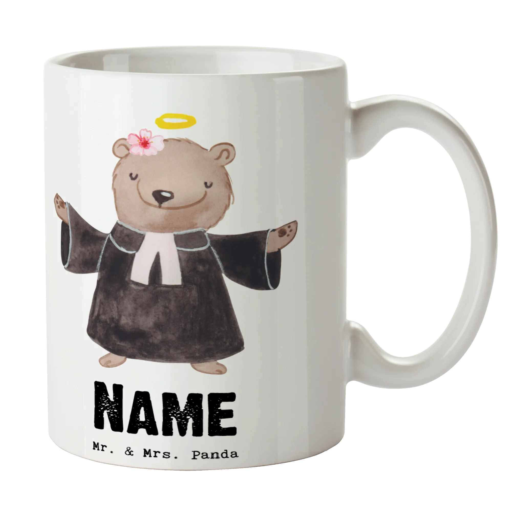 Das kreative Design zeigt einen süßen Bären in Priesterrobe, der mit erhobenen Händen seinen Segen spricht. Mit dem Spruch "Du bist nur ein halber Mensch, wenn du keine Pfarrerin bist" wird jeder Schluck aus dieser Tasse ein persönliches Erlebnis.