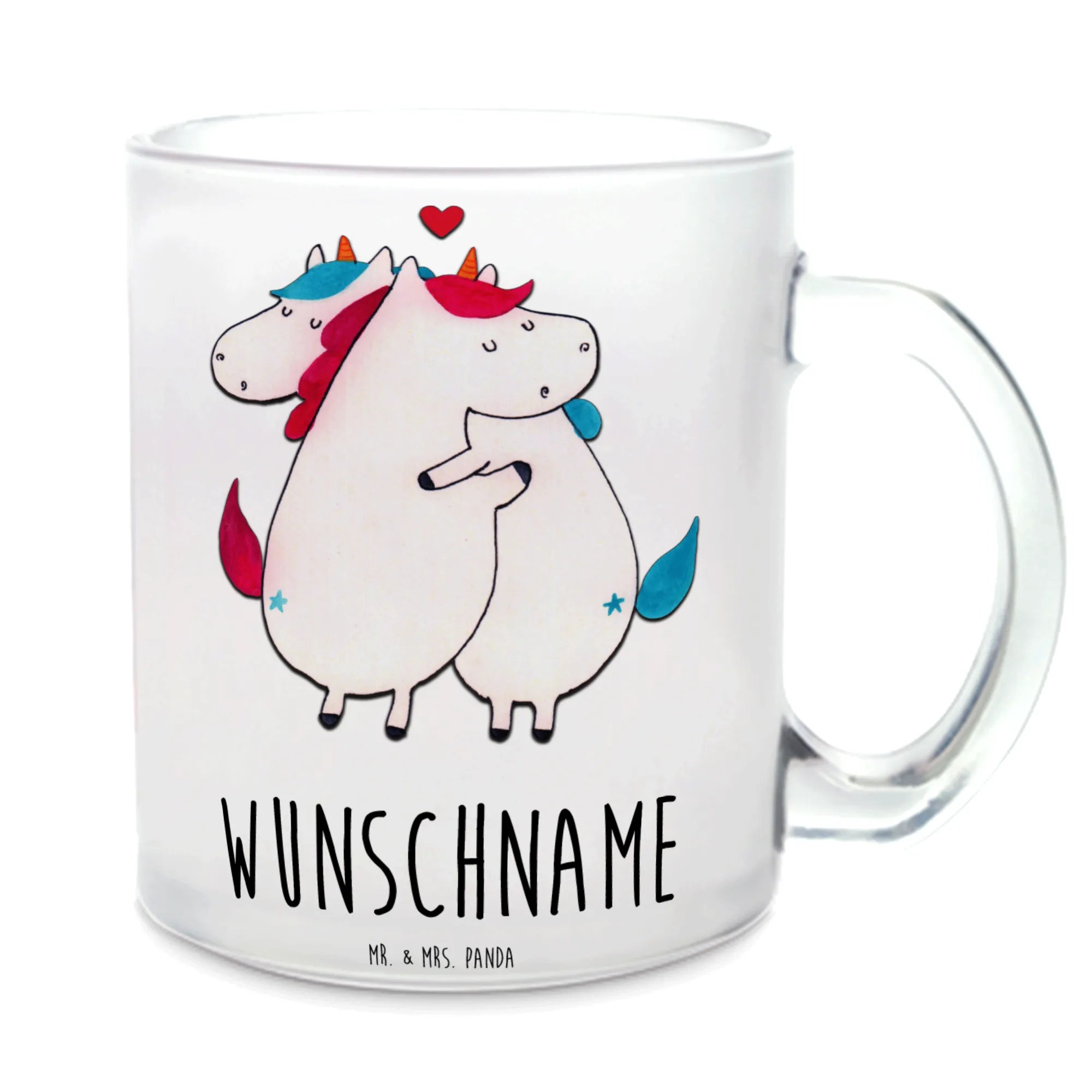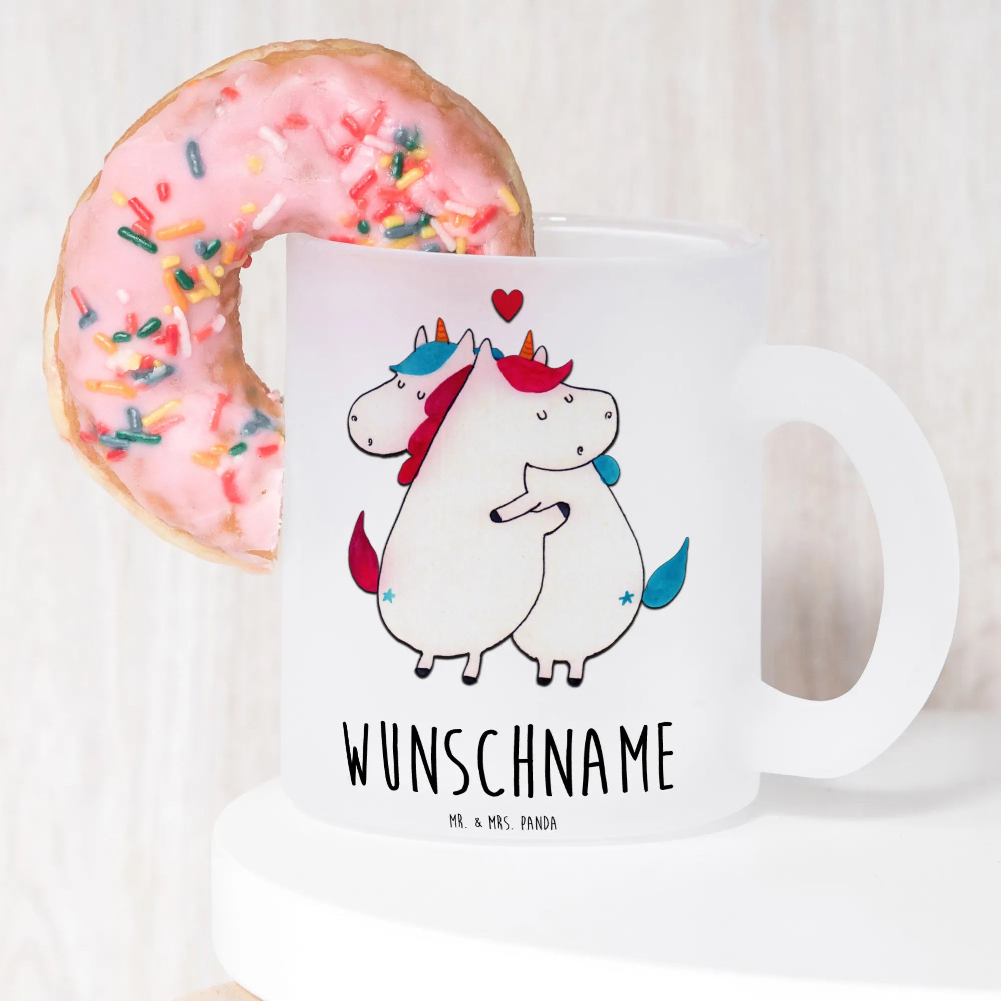 Die zwei kuschelnden Einhörner, die sich mit liebevollen Blicken umarmen, strahlen pure Zuneigung und Wärme aus. Die Tasse ist personalisierbar mit deinem Wunschtext oder Wunschnamen, wodurch sie zu einem ganz persönlichen und einzigartigen Geschenk wird.