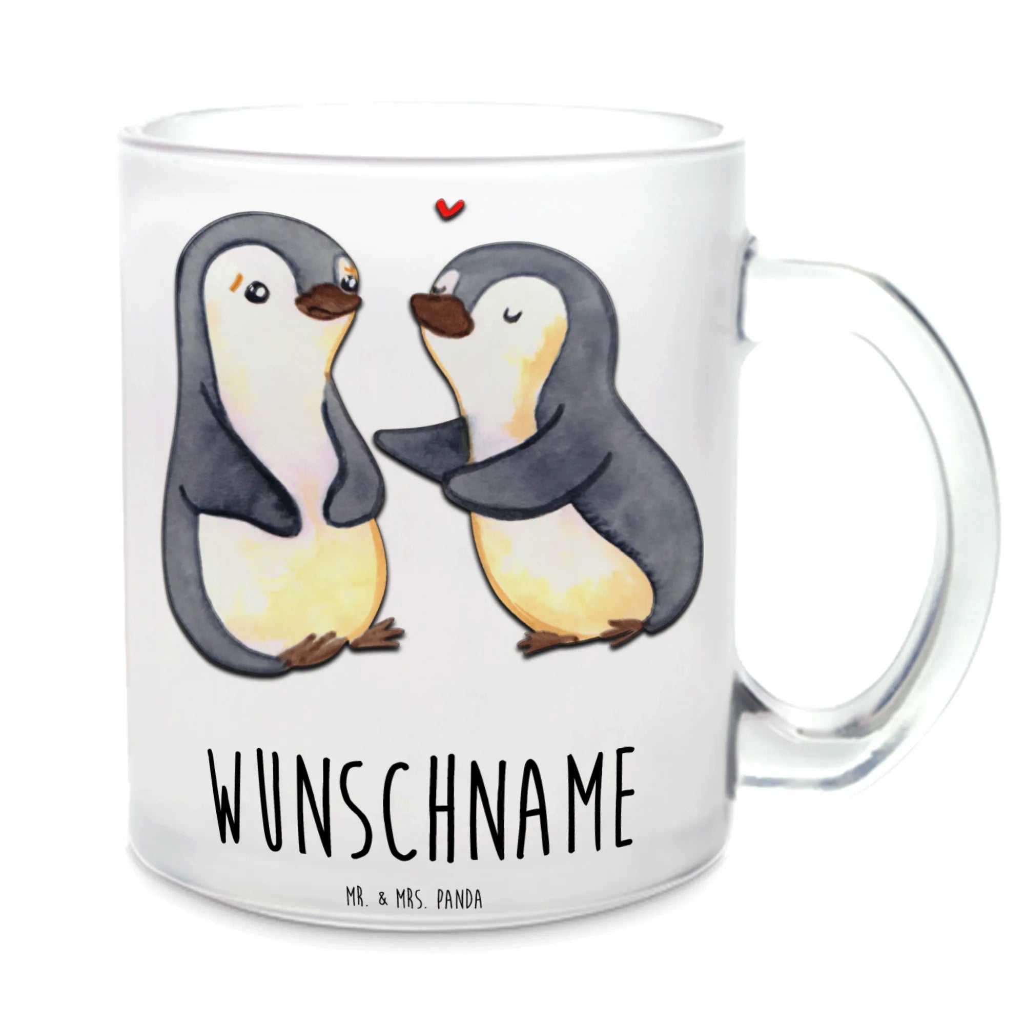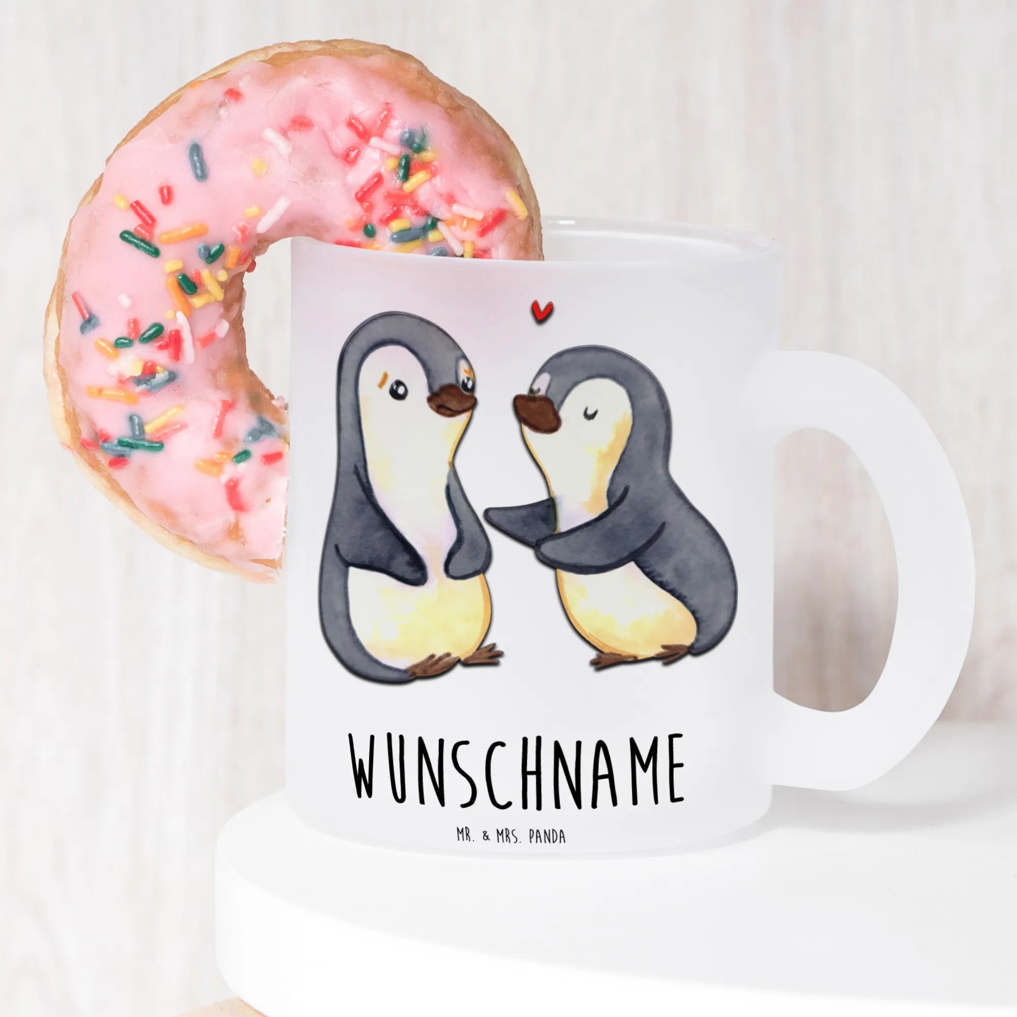 Die Tasse ist aus robustem, extra starkem Glas gefertigt und hat eine edle, matte Oberfläche, die jedes Getränk zu einem besonderen Erlebnis macht. Die beiden Pinguine auf der Tasse zeigen sich in zarten Grau- und Weißtönen, während ihr warmer Gelbton eine gemütliche Atmosphäre schafft. Diese Tasse ist personalisierbar mit Deinem Wunschtext oder Namen, was sie zu einem unverwechselbaren Liebesgeschenk für Freundinnen, Partner oder Ehemänner macht.