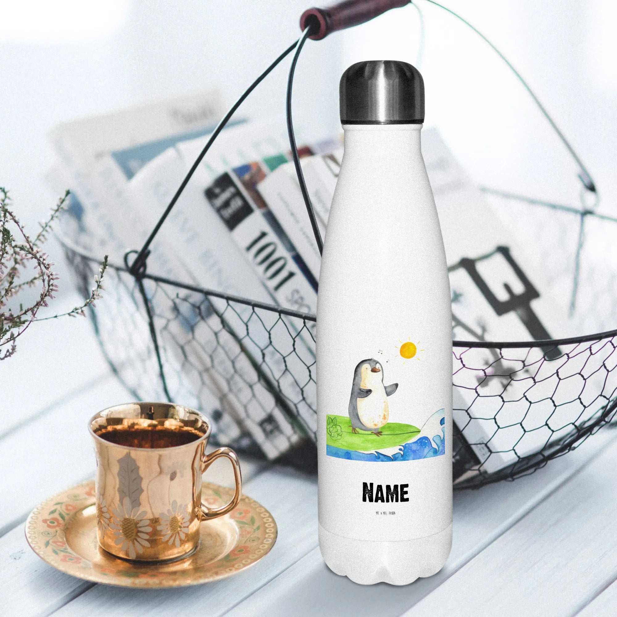 Die personalisierte Thermosflasche mit dem zauberhaften Pinguin Surfer Motiv von Mr. & Mrs. Panda ist nicht nur ein praktischer Begleiter für jeden Tag, sondern auch ein einzigartiges Geschenk für Freunde und Familie. Mit einem Füllvolumen von 500 ml ist sie ideal für alle Heiß- und Kaltgetränke, von duftendem Tee bis zu erfrischendem Wasser. Die doppelwandige Konstruktion aus robustem Edelstahl sorgt dafür, dass Deine Getränke lange heiß oder kalt bleiben, egal ob Du unterwegs bist, im Büro arbeitest oder beim Sport aktiv bist.
