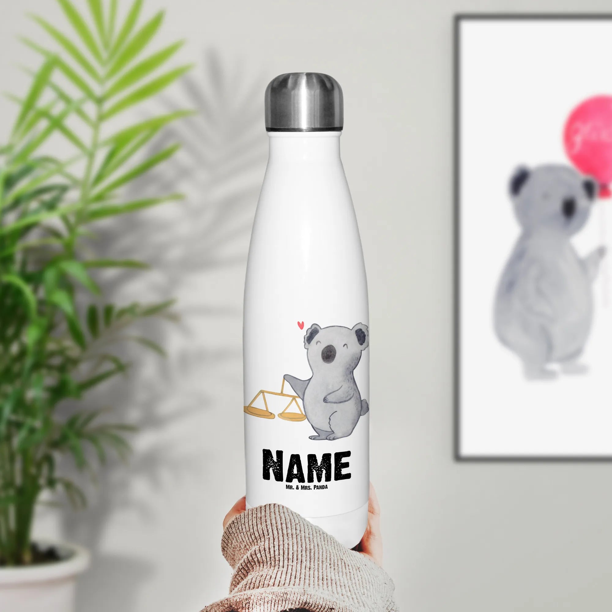 Das besondere Motiv zeigt einen niedlichen Koala, der neben einer klassischen Balkenwaage posiert, das astrologische Symbol der Waage. Umgeben von einem liebevollen Design, das von Mrs. Panda handgezeichnet wurde, ist die Flasche ein wahrer Eyecatcher und ein treuer Begleiter durch den Alltag.