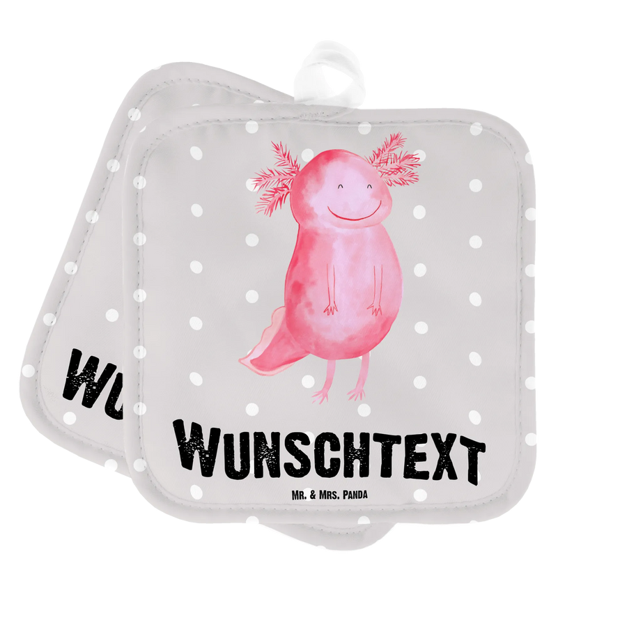 Entdecke die personalisierten Topflappen von Mr. & Mrs. Panda mit dem süßen Axolotl-Motiv: "Axolotl glücklich"!