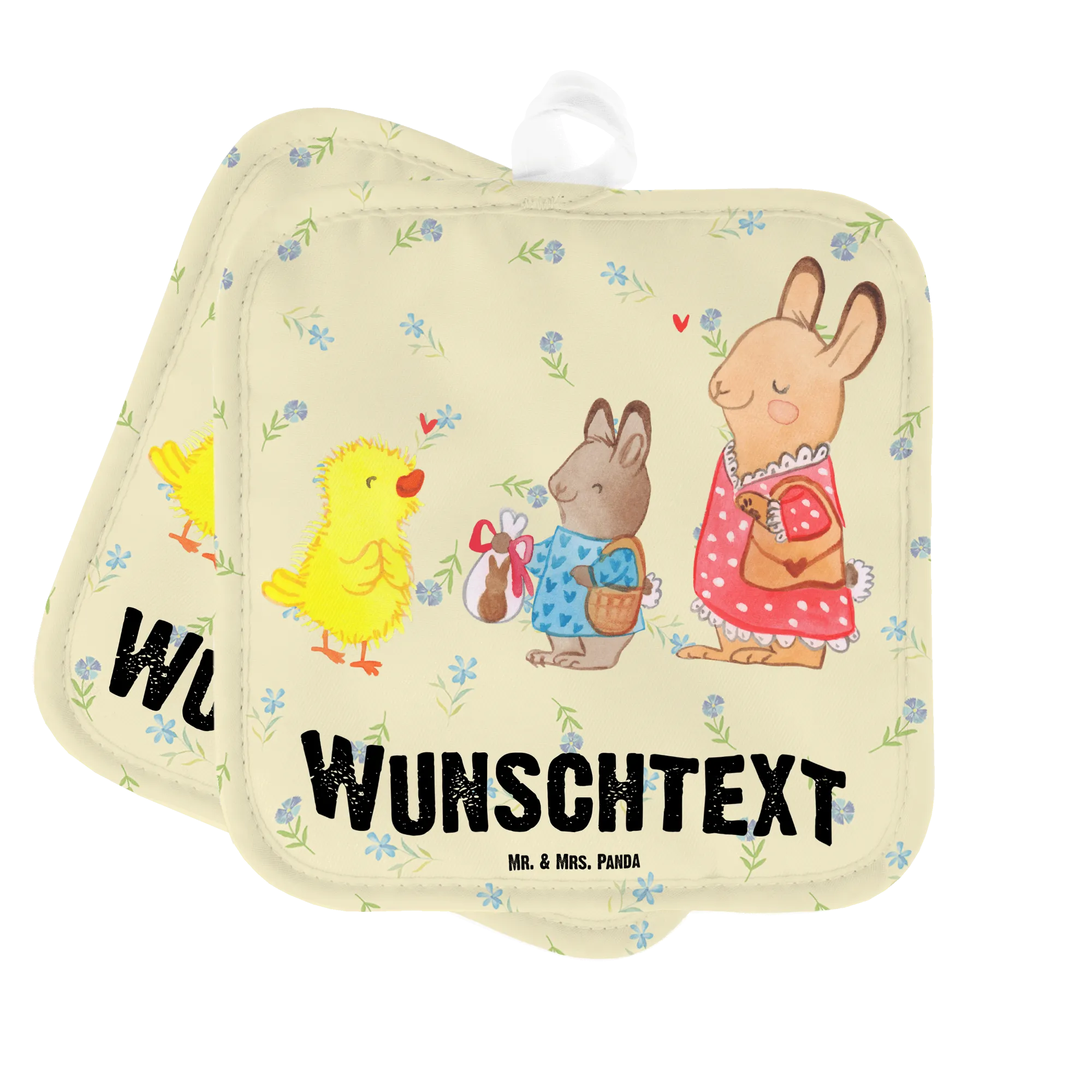 Verschenke liebevolle Osterfreude mit unseren personalisierten Topflappen von Mr. & Mrs. Panda! Diese zwei wunderschönen Topflappen sind nicht nur praktisch in der Küche, sie bringen auch eine fröhliche Osteratmosphäre in dein Zuhause. Mit einem charmanten Motiv, das die zarte Hasenmama mit ihrem niedlichen Kind zeigt, während sie einem kleinen Küken einen Schokoladen-Osterhasen überreicht, sind sie ein absoluter Hingucker.