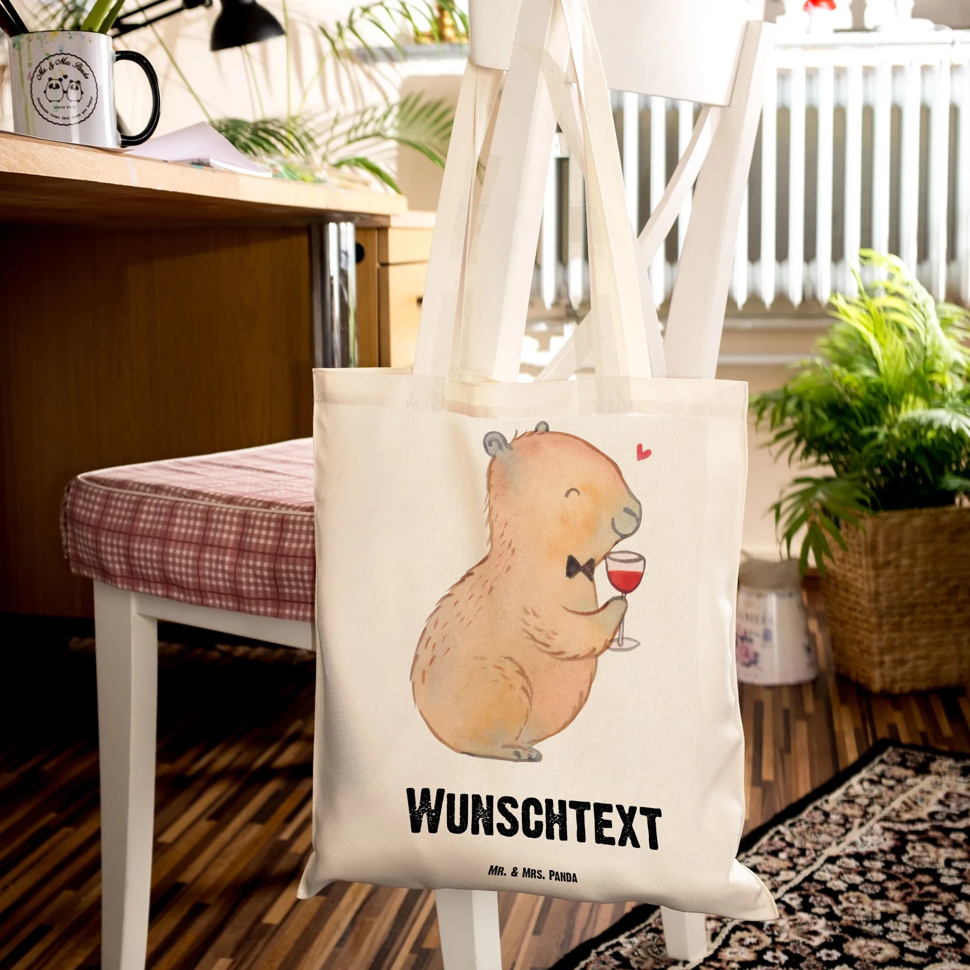 Die personalisierte Tragetasche "Capybara Wein" von Mr. & Mrs. Panda ist das perfekte Geschenk für jeden Weinliebhaber. Mit ihrem charmanten, handgezeichneten Motiv eines glücklichen Capybaras, das mit einer eleganten Fliege ein Glas Wein hält, strahlt diese Tasche pure Lebensfreude aus.