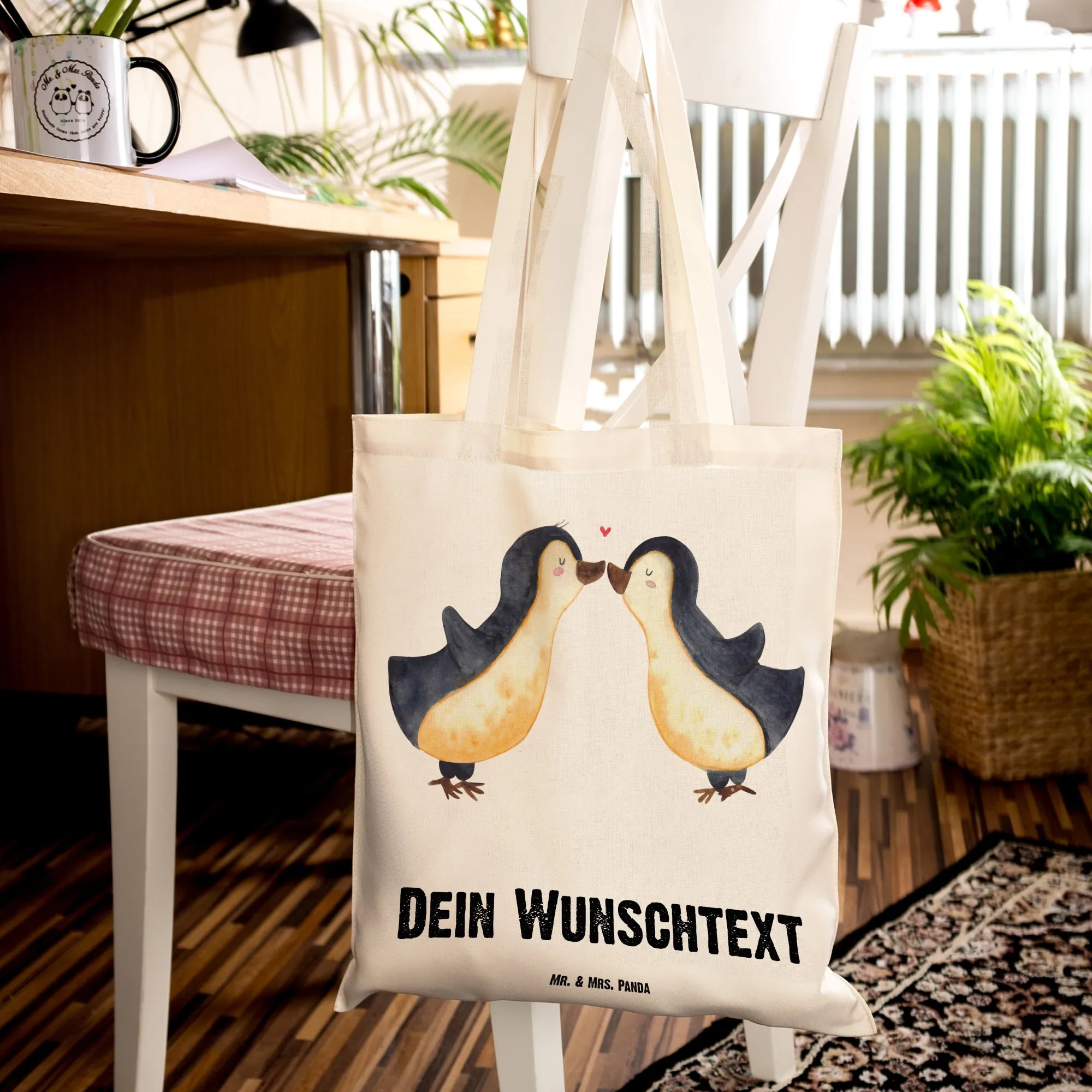 Mit der personalisierten Tragetasche von Mr. & Mrs. Panda liegst du immer richtig! Gönn dir ein Stück Liebe und Freude im Alltag mit unserer einmaligen Tragetasche im Pinguine Kuss Design – perfekt für alle, die ihre Gefühle mit einem besonderen Geschenk zeigen möchten.