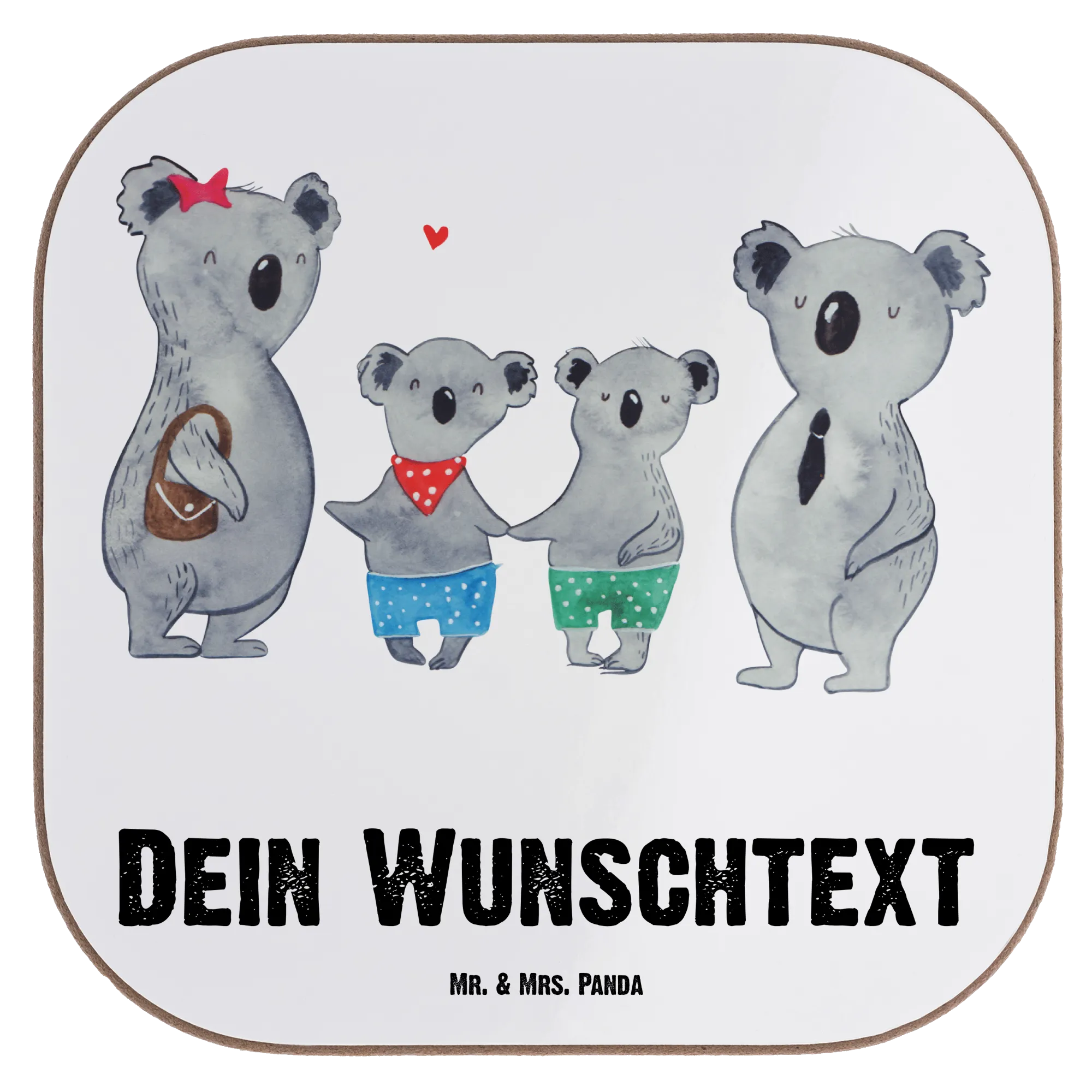 Das Motiv zeigt eine herzliche Koalafamilie: Der große Koala, die Mutterfigur, trägt ein rotes Sternchen im Haar und hält eine braune Tasche, während der Vater im Anzug mit Krawatte und einem sanften Lächeln dargestellt ist. Die beiden kleinen Koalas, die wahrscheinlich die Kinder darstellen, bezaubern mit ihren bunten Shorts und fröhlichen Posen. Dieses liebevoll gestaltete Motiv symbolisiert die Verbundenheit und das Glück, das Familien zusammenbringen.