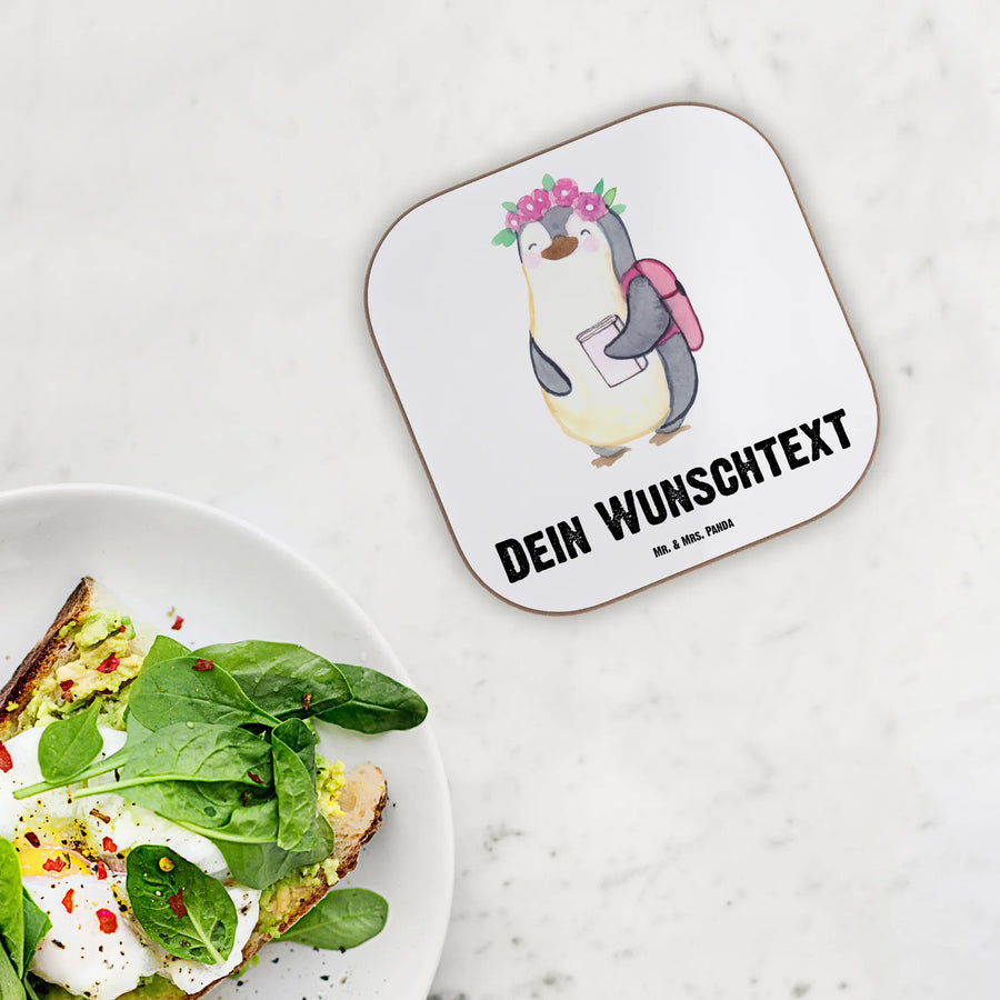 Die glänzende Oberfläche zieht die Blicke auf sich und bringt die Farben des niedlichen Pinguins mit seinen Blumen auf dem Kopf, dem Rucksack und dem Buch in der Hand wunderbar zur Geltung. Dank des durchdachten Designs ist der Untersetzer auch pflegeleicht und kann einfach mit einem feuchten Tuch gereinigt werden.