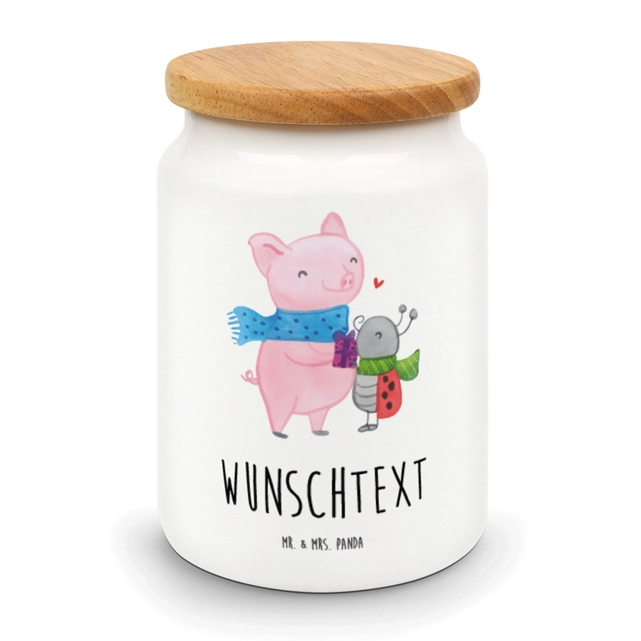 Die personalisierte Vorratsdose mit dem zauberhaften Glühschwein Smörle ist das perfekte Geschenk für alle, die die winterlichen Monate lieben! Ob für die eigene Weihnachtsbäckerei oder als liebevolles Geschenk für einen Glühwein-Liebhaber - diese Dose bringt nicht nur Ordnung in die heimische Küche, sondern auch Freude ins Herz. Hergestellt aus hochwertiger Keramik, überzeugt sie durch ihre Langlebigkeit und Qualität. Der massive Holzdeckel mit Kunststoffdichtung sorgt dafür, dass deine Kekse frisch und knusprig bleiben.