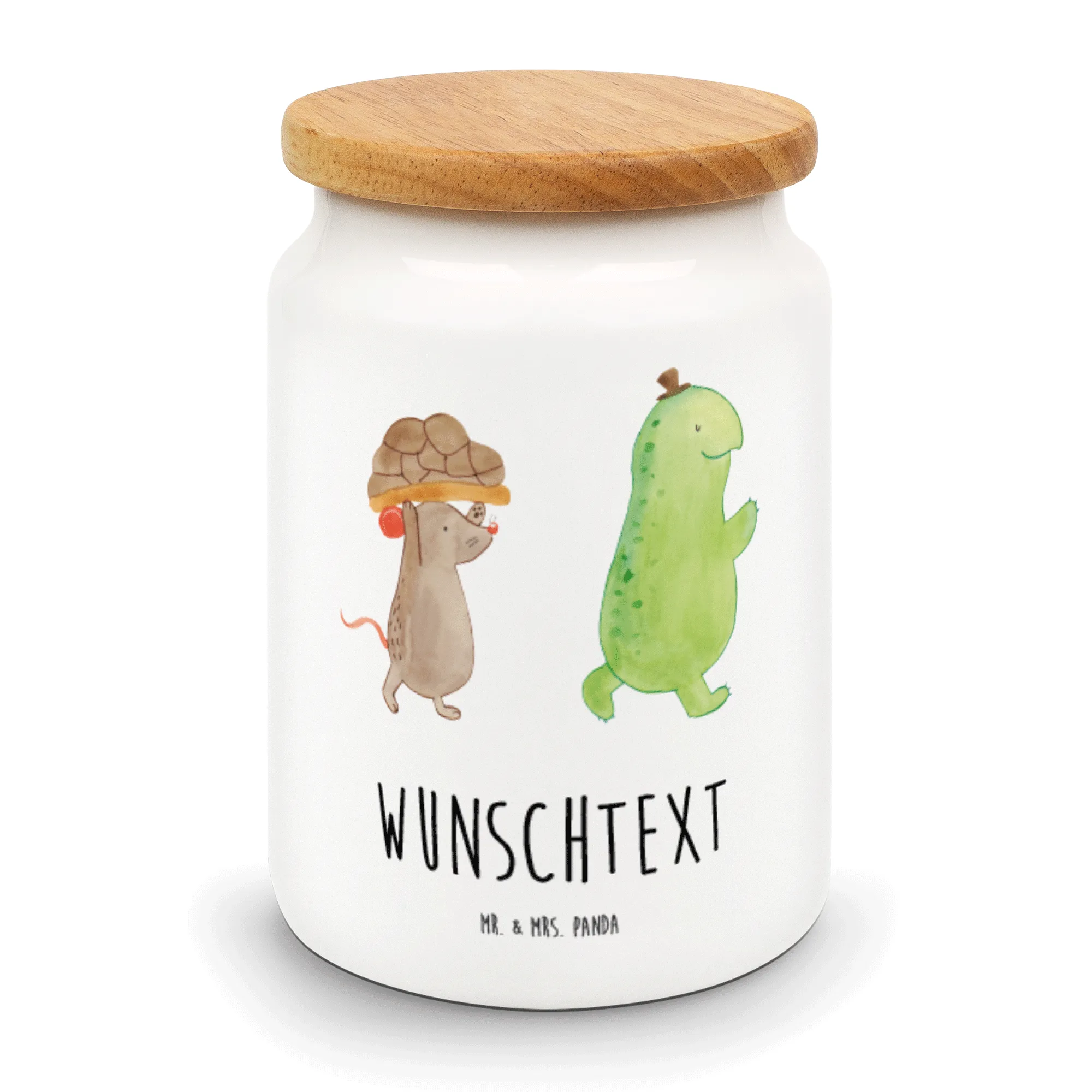 Entdecke die bezaubernde personalisierte Vorratsdose mit dem süßen Schildkröte & Maus Motiv von Mr. & Mrs. Panda! Diese liebevoll bedruckte Keramikdose ist nicht nur funktional, sondern auch ein echter Hingucker in jeder Küche. Egal ob du Kekse, Snacks oder kleine Schätze darin aufbewahren möchtest - diese Dose wird mit ihrer Höhe von 145 mm und einem Durchmesser von 95 mm zu einem besonderen Teil deines Wohnraums. Die Füllmenge von 650 ml reicht perfekt aus, um all deine Leckereien sicher zu verwahren.