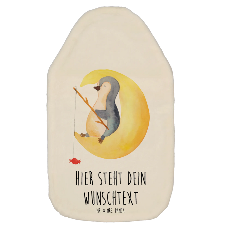 Wärme, Geborgenheit und ein Augenzwinkern – die personalisierte Wärmflasche "Pinguin Mond" aus der Pinguin - Kollektion von Mr. & Mrs. Panda ist das perfekte Geschenk für Kinder und alle, die Kuscheligkeit lieben. Ein süßer Pinguin hat es sich auf einer Mondsichel gemütlich gemacht und angelt nach Sternen – an der Angel hängt ein Bonbon. Das liebevoll handgezeichnete Motiv kombiniert sich mit dem lustigen Spruch „Ich und mein Körper wollen schlafen, aber mein Kopf will wissen, ob Pinguine Knie haben...“ und sorgt für Schmunzeln beim Einschlafen. 🌙