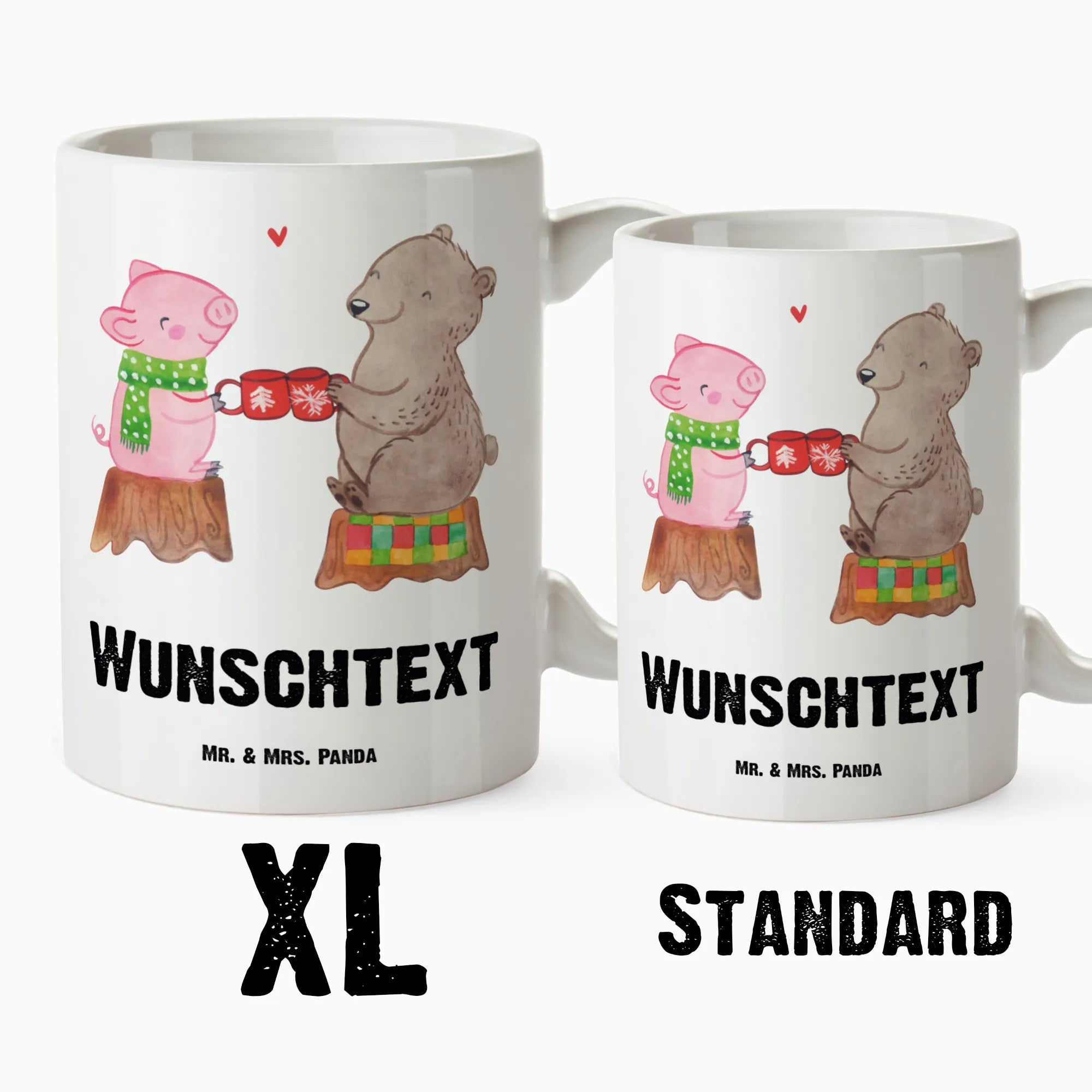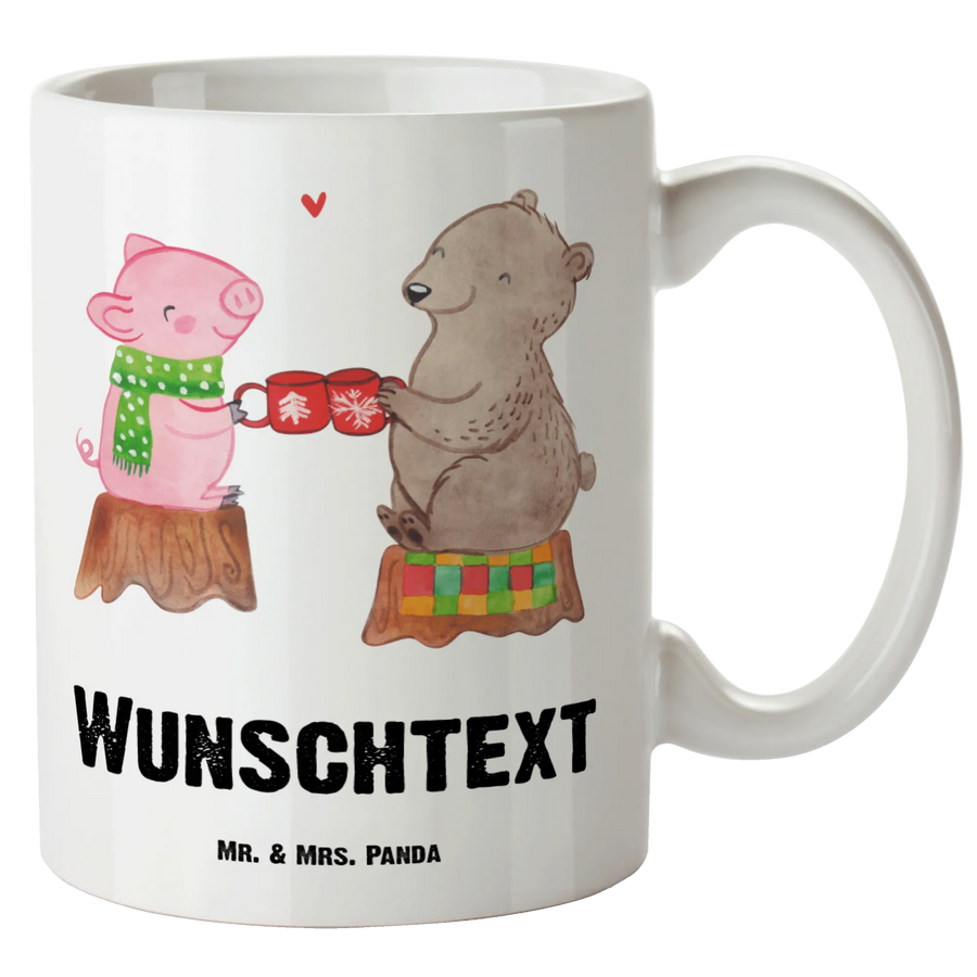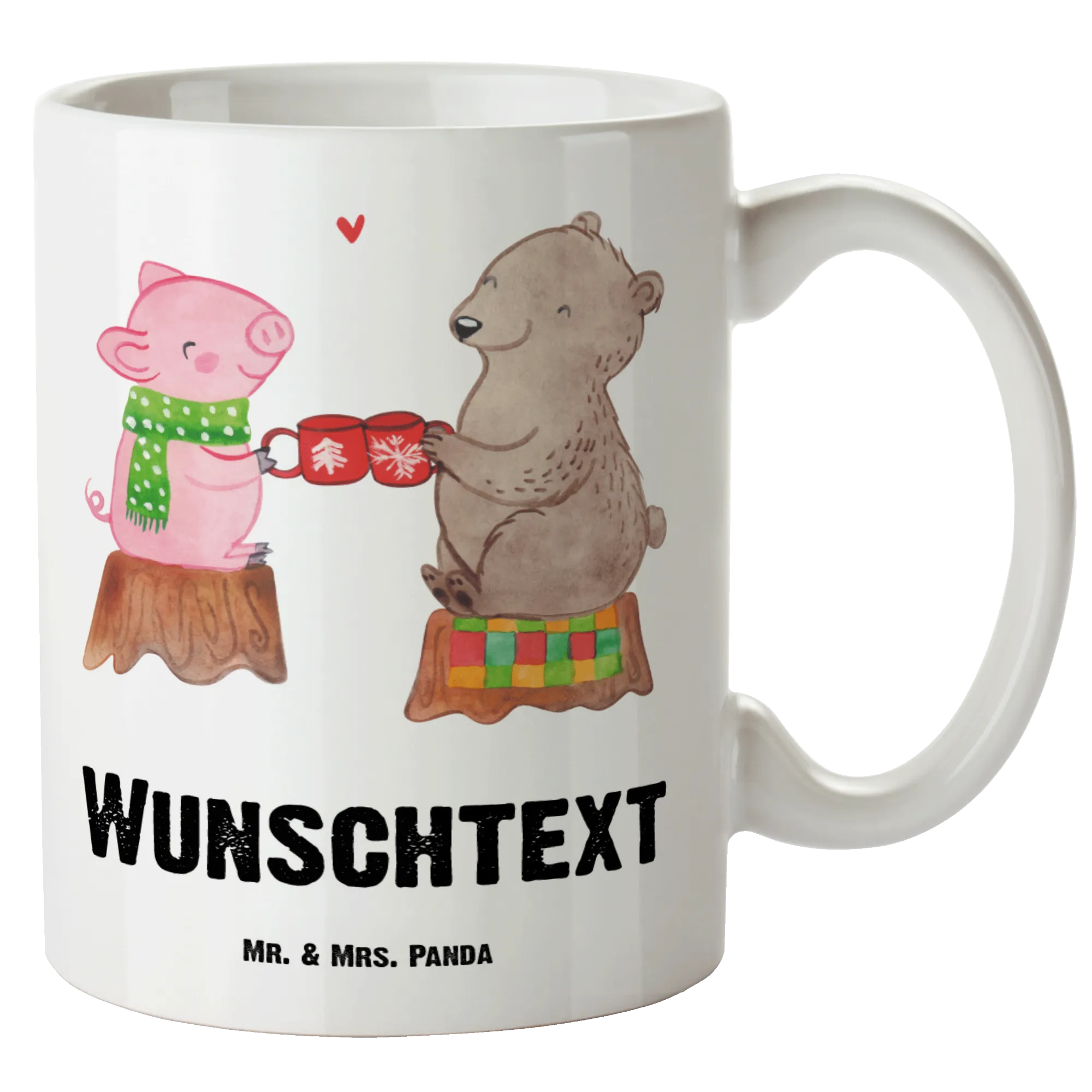 Das farbenfrohe Design zeigt ein niedliches Schweinchen mit einem Schal und einen Bären, die zusammen auf einem Baumstumpf anstoßen und mit einem kleinen Herz miteinander verbunden sind. So zaubert die Tasse nicht nur ein Lächeln auf die Gesichter der Beschenkten, sondern auch eine warme, herzerwärmende Atmosphäre. Besonders gut eignet sich die personalisierte große Tasse für festliche Anlässe wie Weihnachten, Nikolaus oder Heiligabend.