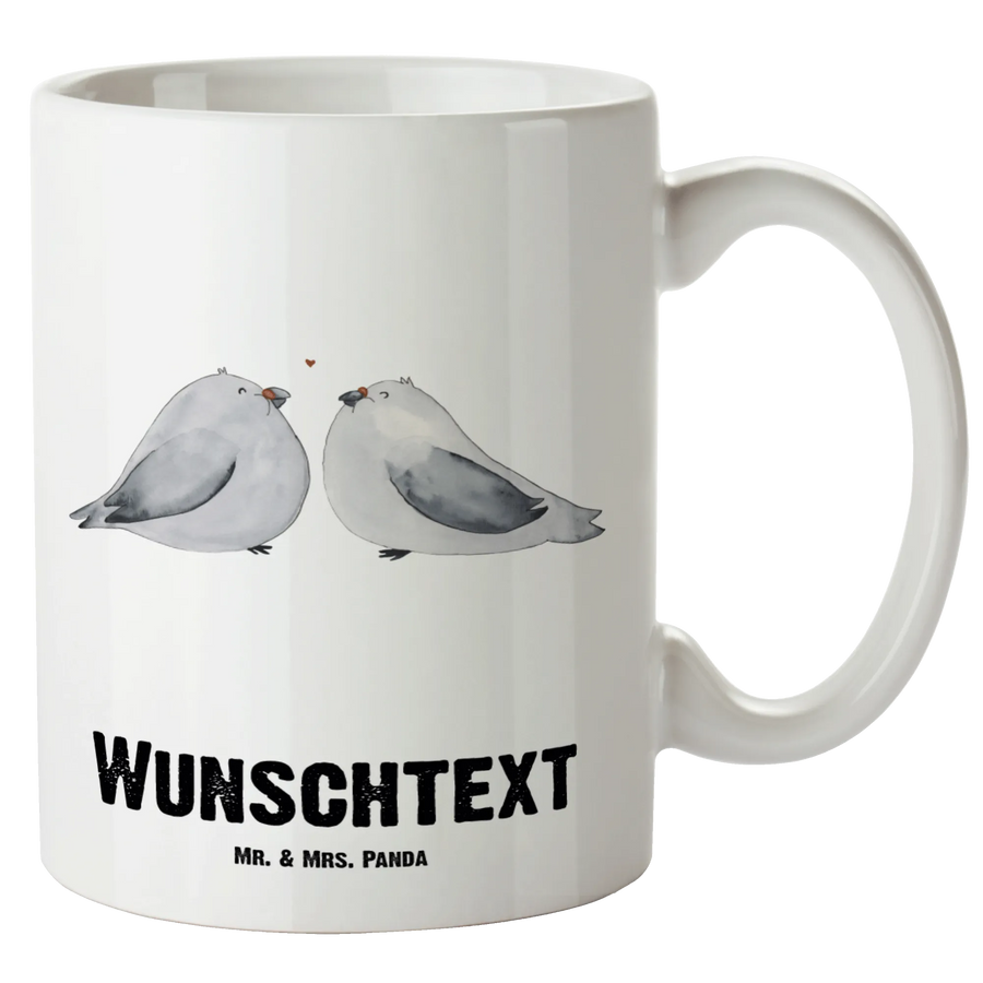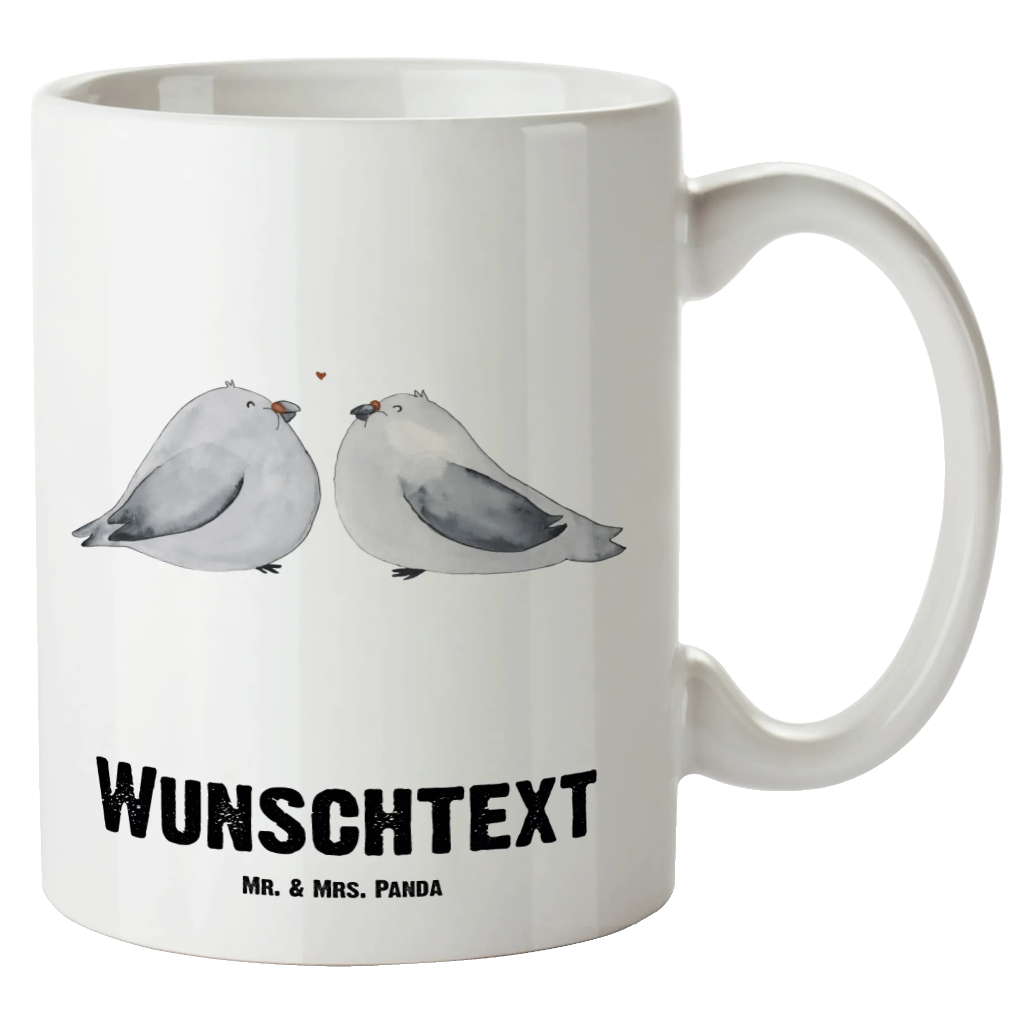 Mit einem Füllvolumen von 500 ml und der hochwertigen Keramik verarbeitet, bietet sie genug Platz für deinen Lieblingskaffee oder Tee und macht jeden Morgen zu einem besonderen Moment. Ob für den Jahrestag, den Hochzeitstag oder einfach als kleines Dankeschön für die Liebe – die personalisierte XL Tasse überzeugt durch ihr stilvolles Design und die handgemalte Illustration zweier verliebter Turteltauben, die zärtlich beieinander sitzen und durch ein rotes Herz verbunden sind.
