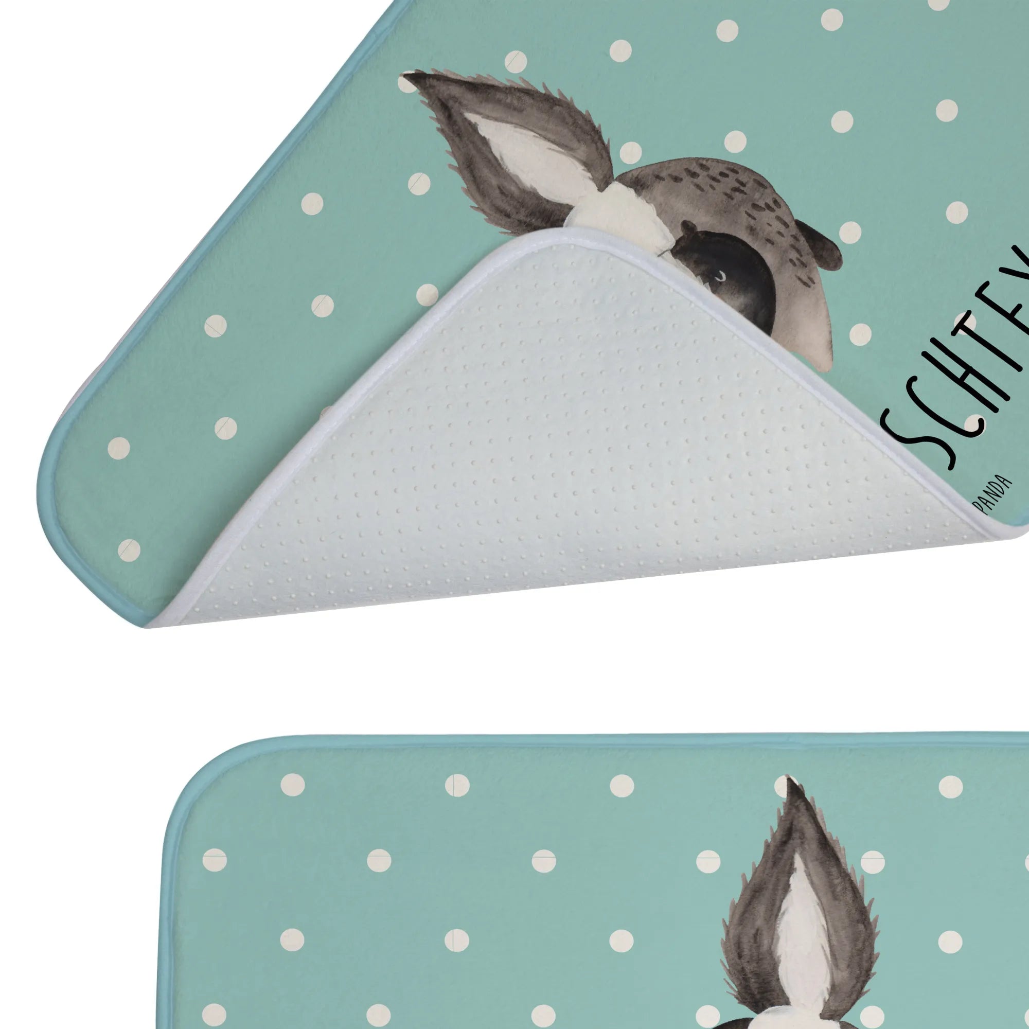 Hol dir mit unserem personalisierten Badvorleger von Mr. & Mrs. Panda ein Stück Persönlichkeit in dein Badezimmer! Er hat die perfekten Maße von 590 mm x 400 mm und wird mit zauberhaften Motiven und deinem gewünschten Text bedruckt. Der Badteppich aus flauschiger Premium Kunstfaser gibt deinem Badezimmer nicht nur eine tolle Optik, sondern sorgt durch die rutschfeste Gummibeschichtung auch für Sicherheit. Ideal für den Einsatz nach einem entspannenden Bad oder einer erfrischenden Dusche. Unsere liebevolle Gestaltung macht den Badvorleger zu einem ganz besonderen Geschenk, das für Freude sorgt. Zudem ist er besonders saugstark und pflegeleicht: Einfach bei 30°C in der Waschmaschine waschen und schon erstrahlt er wieder in neuem Glanz!
