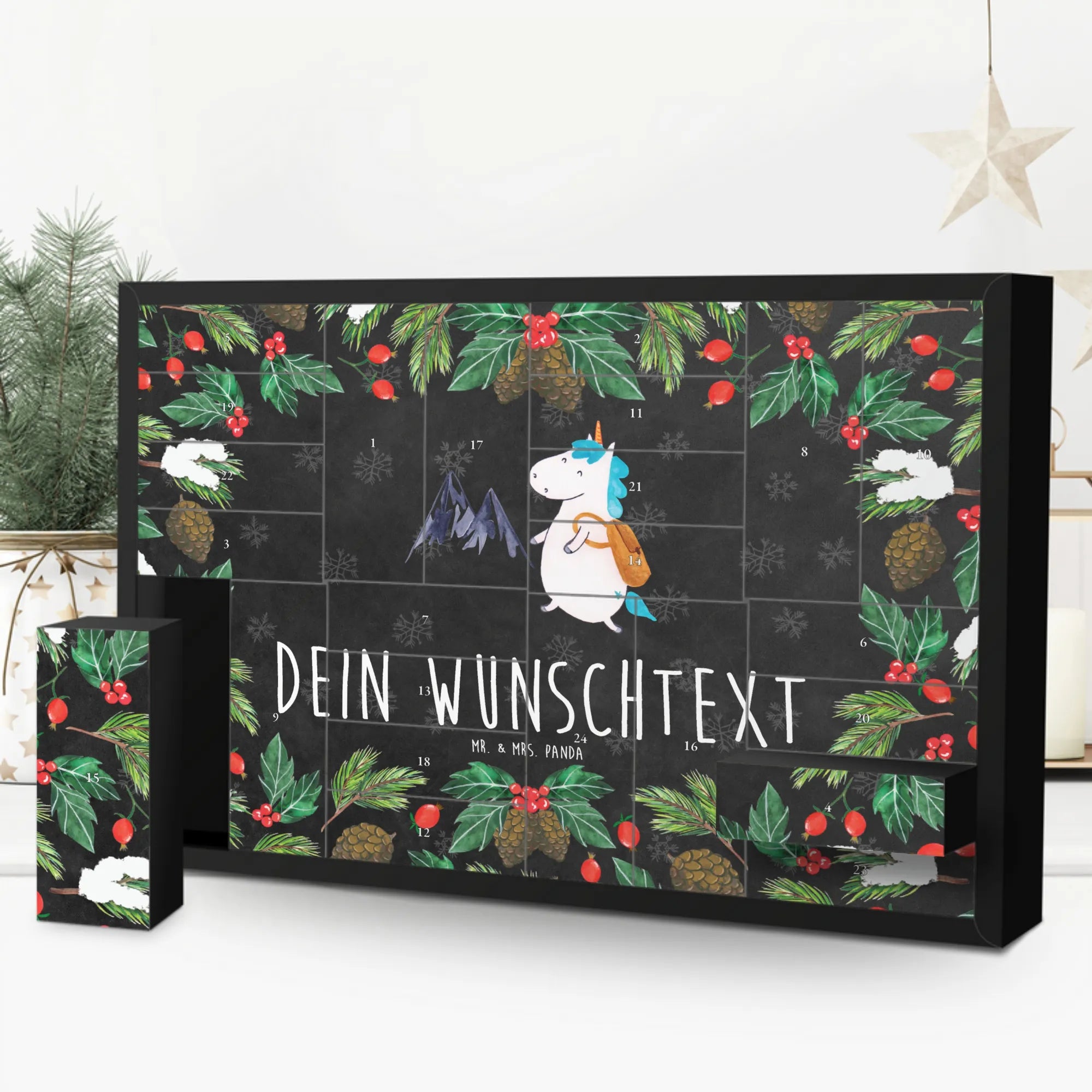 Der personalisierte, befüllbare Adventskalender Einhorn Bergsteiger von Mr. & Mrs. Panda ist das perfekte Geschenk für abenteuerlustige Seelen und Einhorn-Liebhaber! Mit einer liebevollen Zeichnung von Mrs. Panda, die ein niedliches Einhorn zeigt, das mit Rucksack die Berge erklimmt, wird dieser Adventskalender zum echten Hingucker.