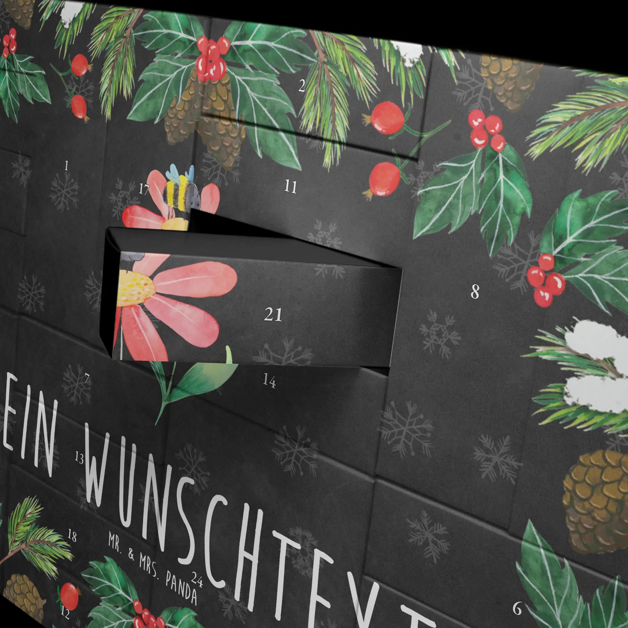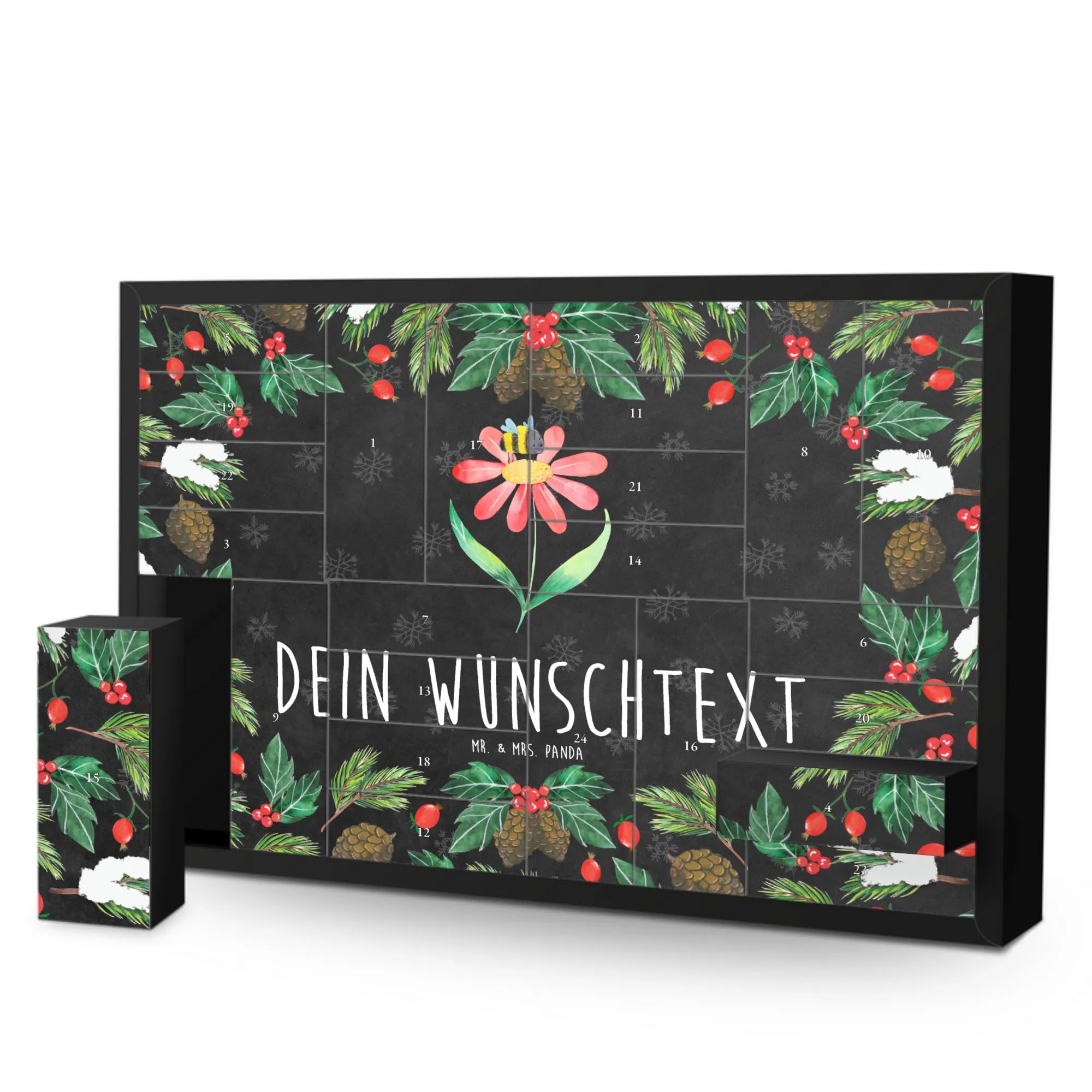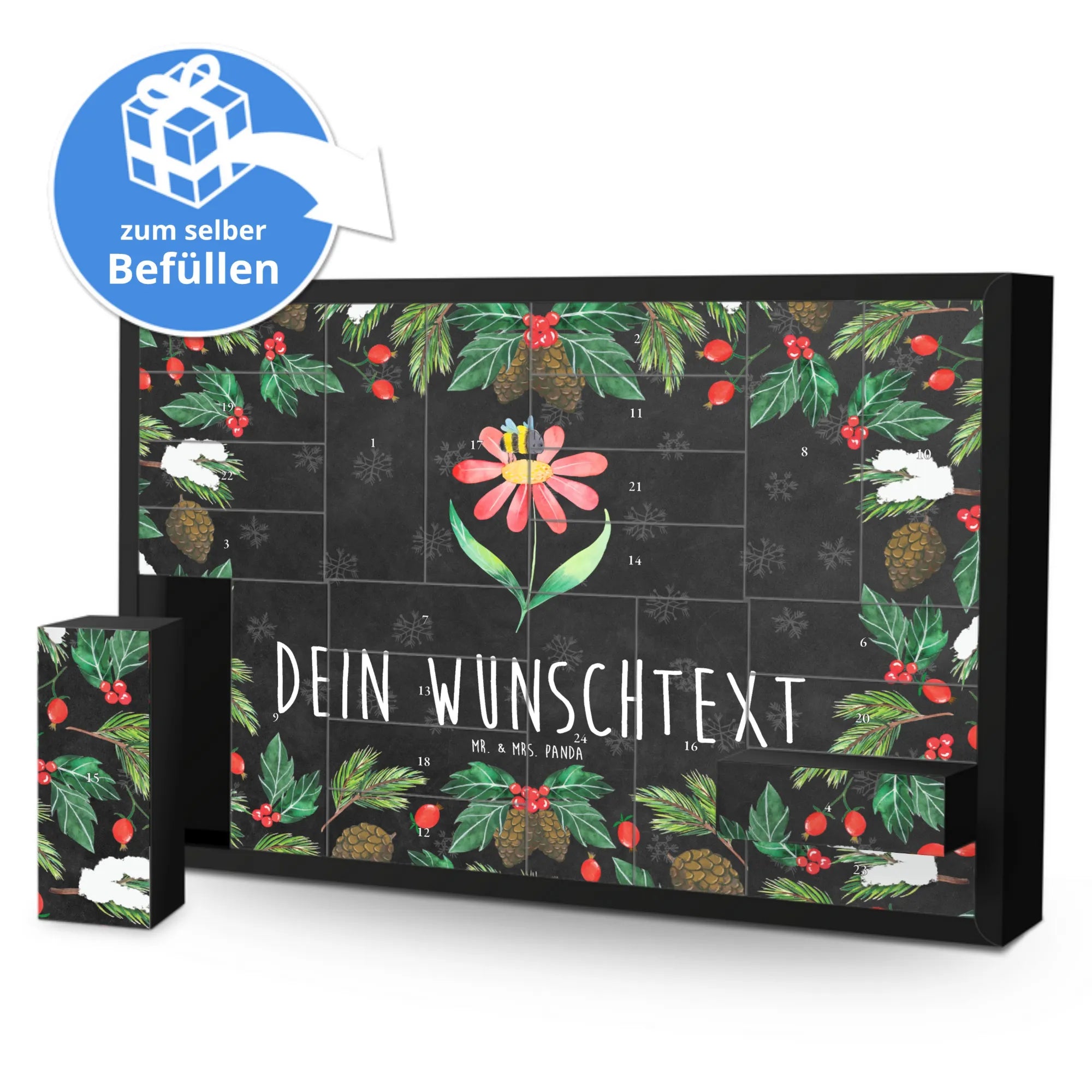 Der personalisierte befüllbare Adventskalender mit dem zauberhaften Motiv "Hummel Blume" aus der Small World Kollektion von Mr. & Mrs. Panda ist das perfekte Geschenk für alle, die Freude und gute Laune in der Adventszeit lieben!