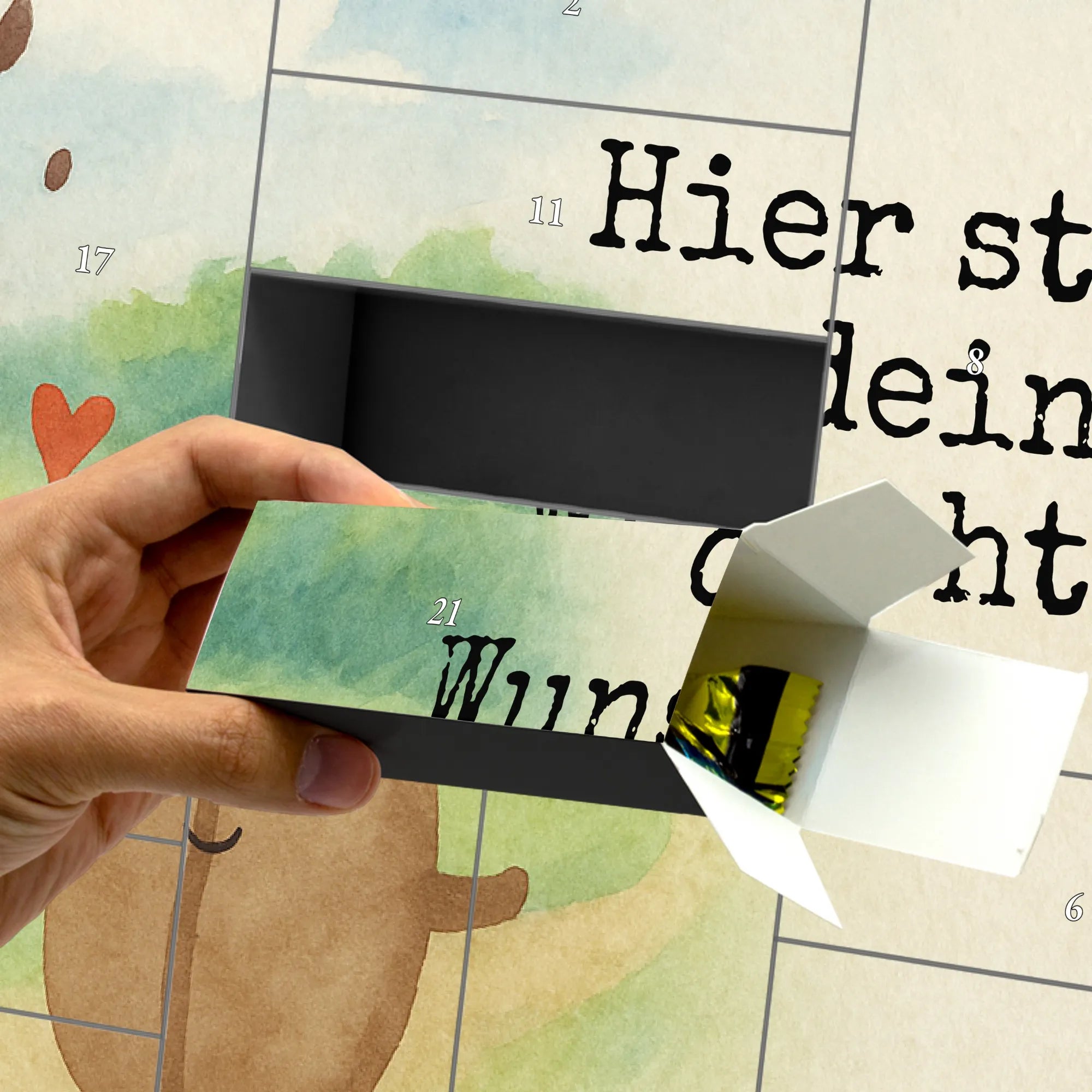 Personalisierter Adventskalender zum Befüllen – die süße Idee von Mr. & Mrs. Panda für deine individuelle Adventszeit! Der Kalender ist liebevoll gestaltet, mit vielen warmen Sprüchen und der charmanten Zeichnung von Mrs. Panda auf der Vorderseite. Du kannst deinen Namen oder einen Wunschtext hinzufügen, damit der Kalender ganz persönlich wird. Er besteht aus stabilem Adventskalender Karton, hat eine seidenmatte Oberfläche und besticht durch brillante Druckqualität. Mit 24 Schachteln zum Selbstbefüllen kannst du jeden Tag im Dezember mit einer kleinen Überraschung füllen. Zusätzlich ist eine praktische Aufstellvorrichtung integriert, damit der Kalender überall schön zur Geltung kommt. Besonderer Hinweis: wird ohne Füllung geliefert. Maße: Breite: 619 mm, Höhe: 405 mm, Tiefe: 50 mm. Ideal als Geschenk oder als liebevolle Dekoration für dein Zuhause – voller Herzlichkeit und Panda-Charme.