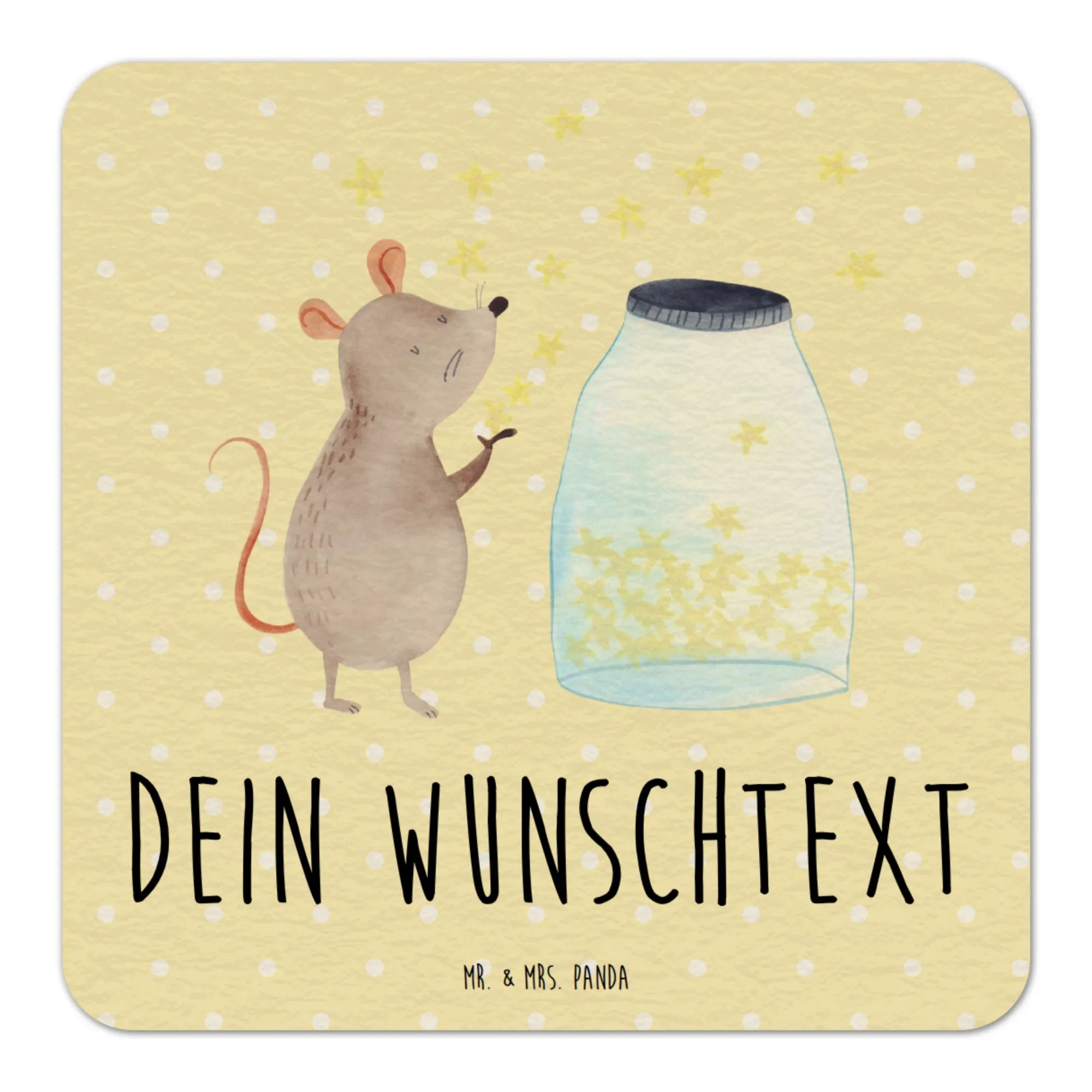 Du kannst ihn ganz nach deinen Wünschen gestalten, indem du deinen Namen oder einen liebevollen Wunschtext hinzufügen lässt. Stell dir vor, wie die kleine süße Maus vor einem Glas voller Sterne sitzt und dir auf zauberhafte Art die Hoffnung gibt, dass alles möglich ist. Der Spruch "Ich wünsche dir den Glauben an dich selbst, Sonnenschein an grauen Tagen, einen leuchtenden Regenbogen, wenn du mal nicht weiter weißt, und eine unbändige Zuversicht, die dich nie die Hoffnung aufgeben lässt" wird jeden deiner Gäste verzaubern und die Atmosphäre rundum erhellen.
