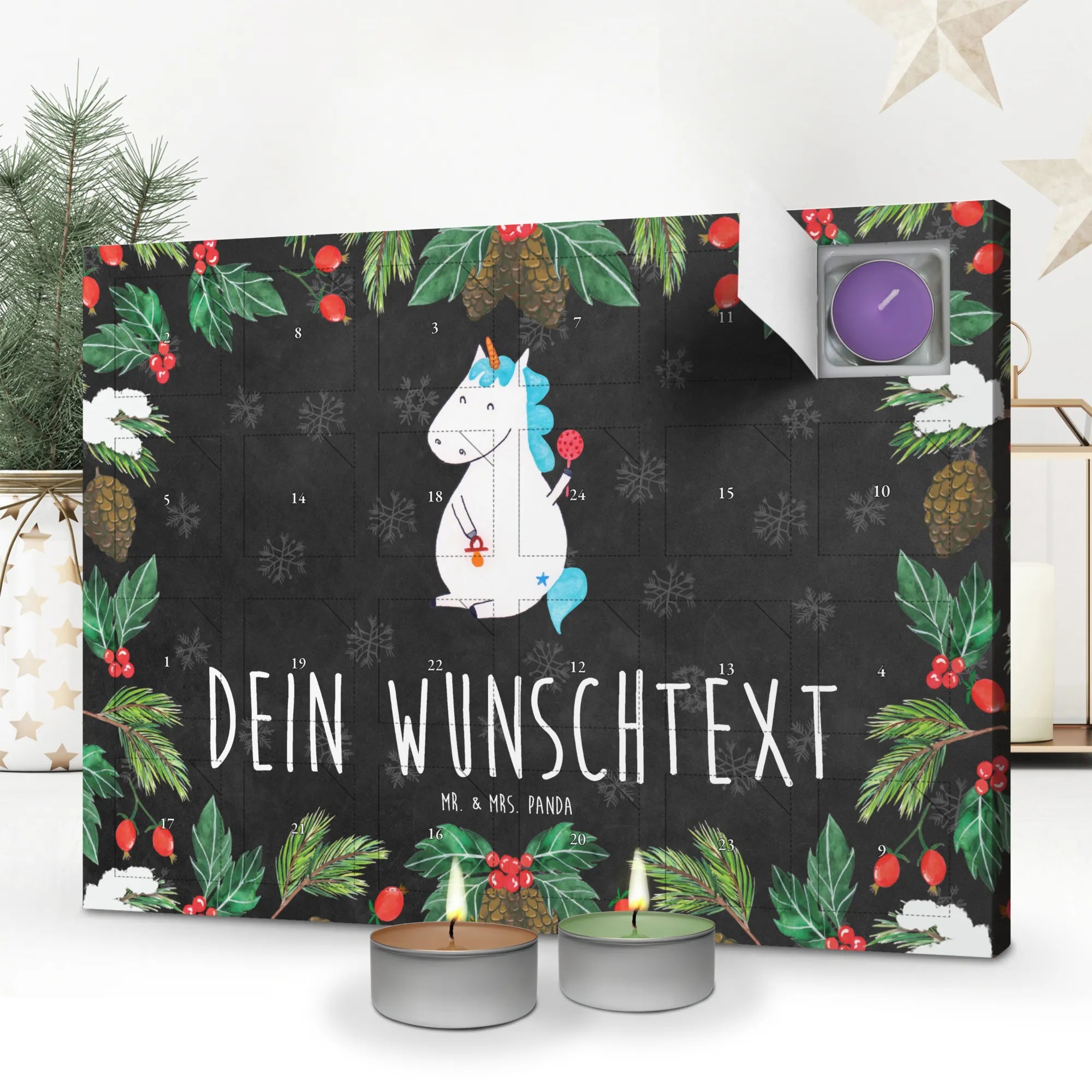 Entdecke den personalisierten Duftkerzen Adventskalender mit dem zauberhaften Einhorn-Motiv für Babys von Mr. & Mrs. Panda! 🦄 Dieser wunderschöne Adventskalender ist das perfekte Geschenk für frischgebackene Eltern und ein absoluter Hit auf jeder Baby-Party.