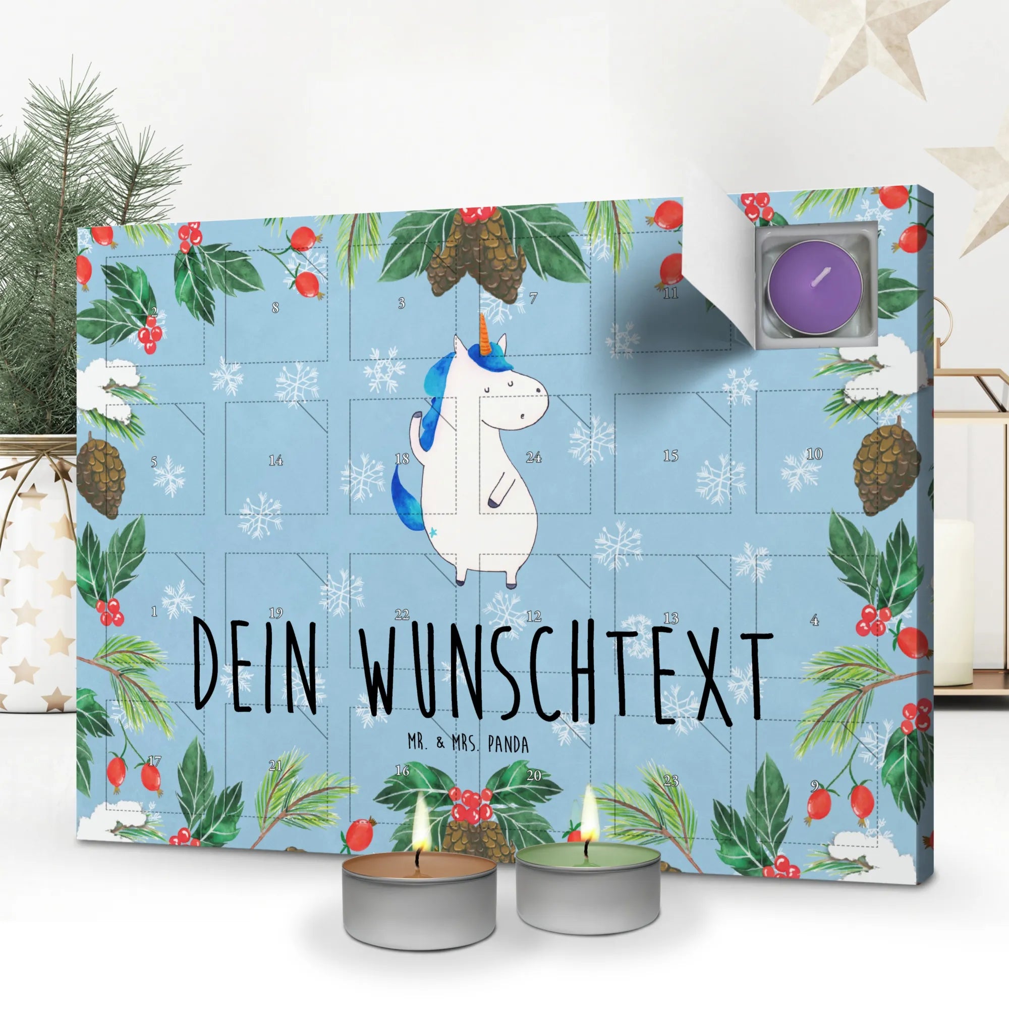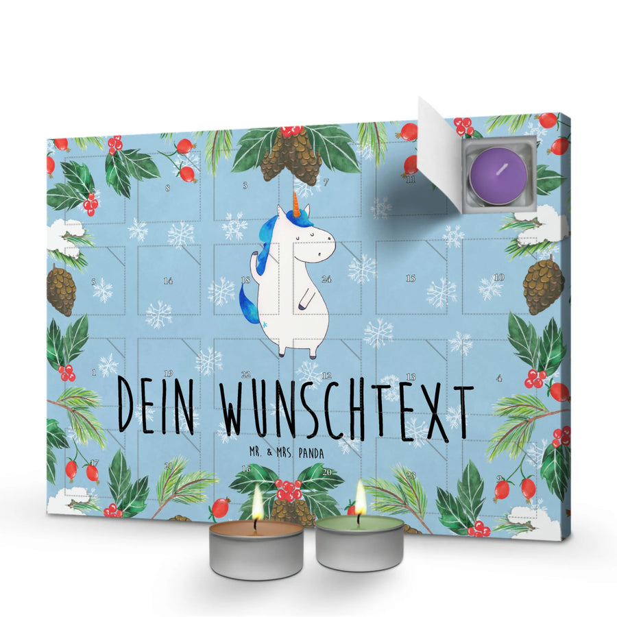 Verschenke Freude, Entspannung und eine Prise Zauber mit dem personalisierten Duftkerzen Adventskalender Einhorn Mann von Mr. & Mrs. Panda. Ein Weihnachtsgeschenk, das die Herzen höher schlagen lässt und die Vorfreude auf die Feiertage steigert! Lass die Einhörner in dein Zuhause! ✨