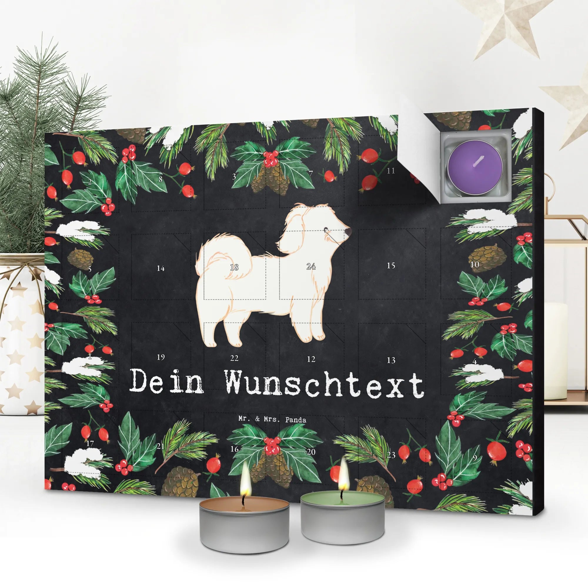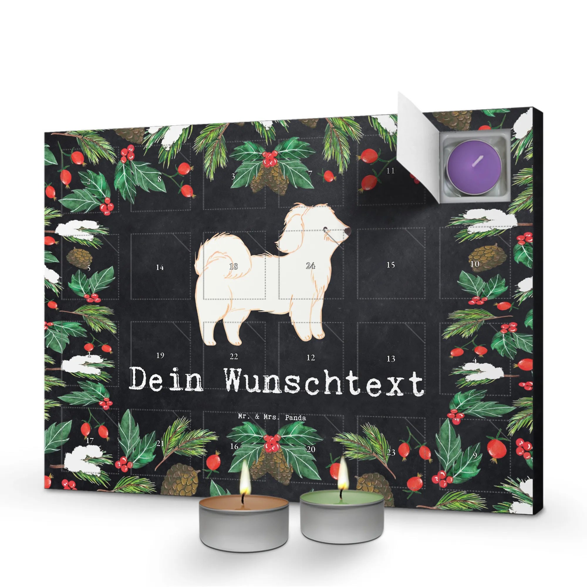 Adventskalender mit personalisierten Duftkerzen – exklusiv von Mr. & Mrs. Panda. Du möchtest einen Adventskalender, der nicht nur schön aussieht, sondern auch nach Weihnachten duftet? Unser personalisierter Duftkerzen-Adventskalender ist genau das Richtige: bedruckt mit liebevollen Sprüchen & Motiven von Mr. & Mrs. Panda und individuell mit deinem Wunschtext oder Wunschnamen gestaltbar. Die Front zeigt eine süße Zeichnung von Mrs. Panda, die jedem Türchen ein Lächeln schenkt. Öffne jeden Tag ein Türchen und genieße wechselnde, weihnachtliche Aromen. Sechs verschiedene Düfte sorgen für Vielfalt: Vanille, Lavendel, Grüner Tee, Apfel-Zimt, Granatapfel und Oud Wood. Gefertigt aus stabilem Adventskalender Karton, fühlt er sich robust und hochwertig an. Du kannst ihn aufhängen oder aufstellen – ganz flexibel. Maße: Breite: 340 mm, Höhe: 247 mm, Tiefe: 18 mm. Ideal zum Verschenken an Freunde, Familie oder als kleine Verwöhnung für dich selbst. Wichtiger Sicherheitshinweis: Kerze nie ohne Unterlage verwenden. Lass dich verzaubern von Duft, Design und persönlicher Note!