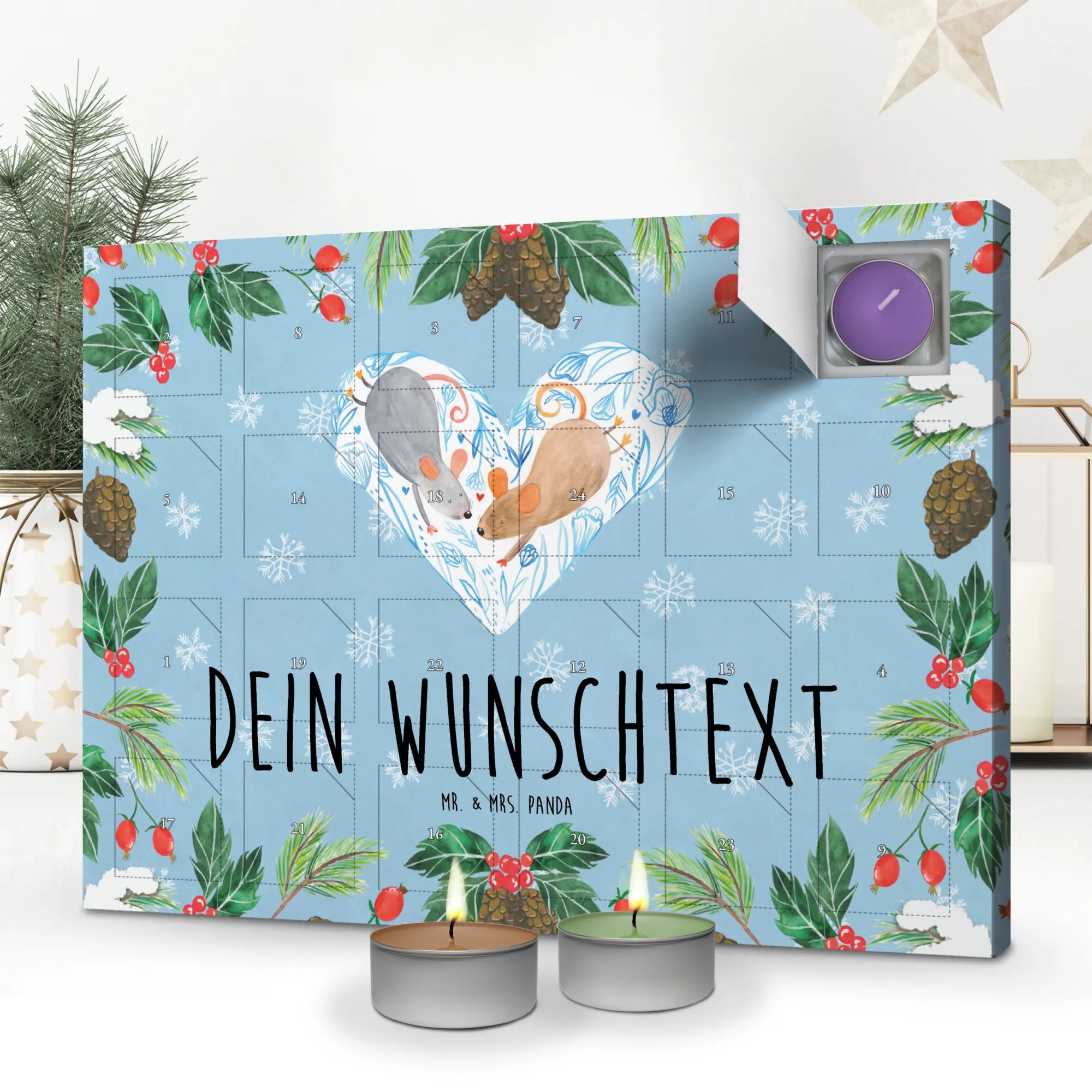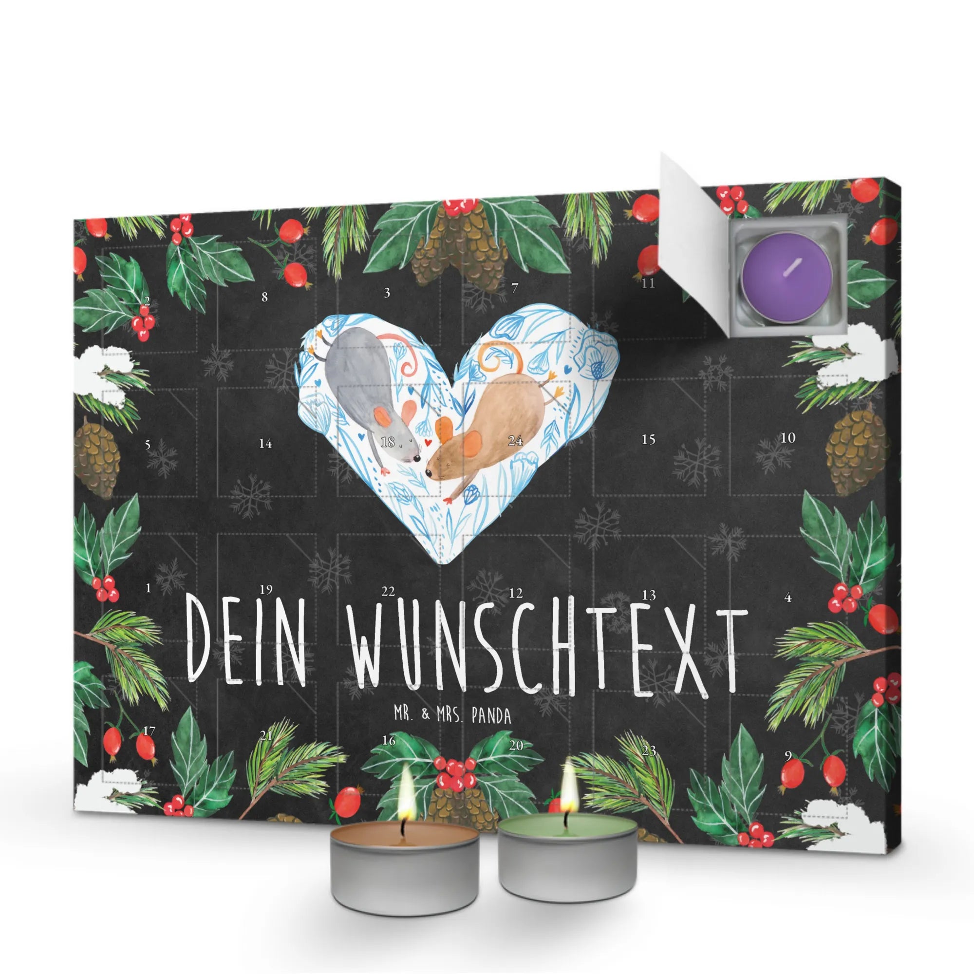 Der personalisierte Duftkerzen Adventskalender Mäuse Herz von Mr. & Mrs. Panda ist das perfekte Geschenk für all die Verliebten, die ihre Zuneigung auf besondere Weise zum Ausdruck bringen möchten. Ob für deinen Lieblingsmenschen oder um gemeinsam besondere Momente zu schaffen, dieser Adventskalender ist ein echter Liebesbeweis.