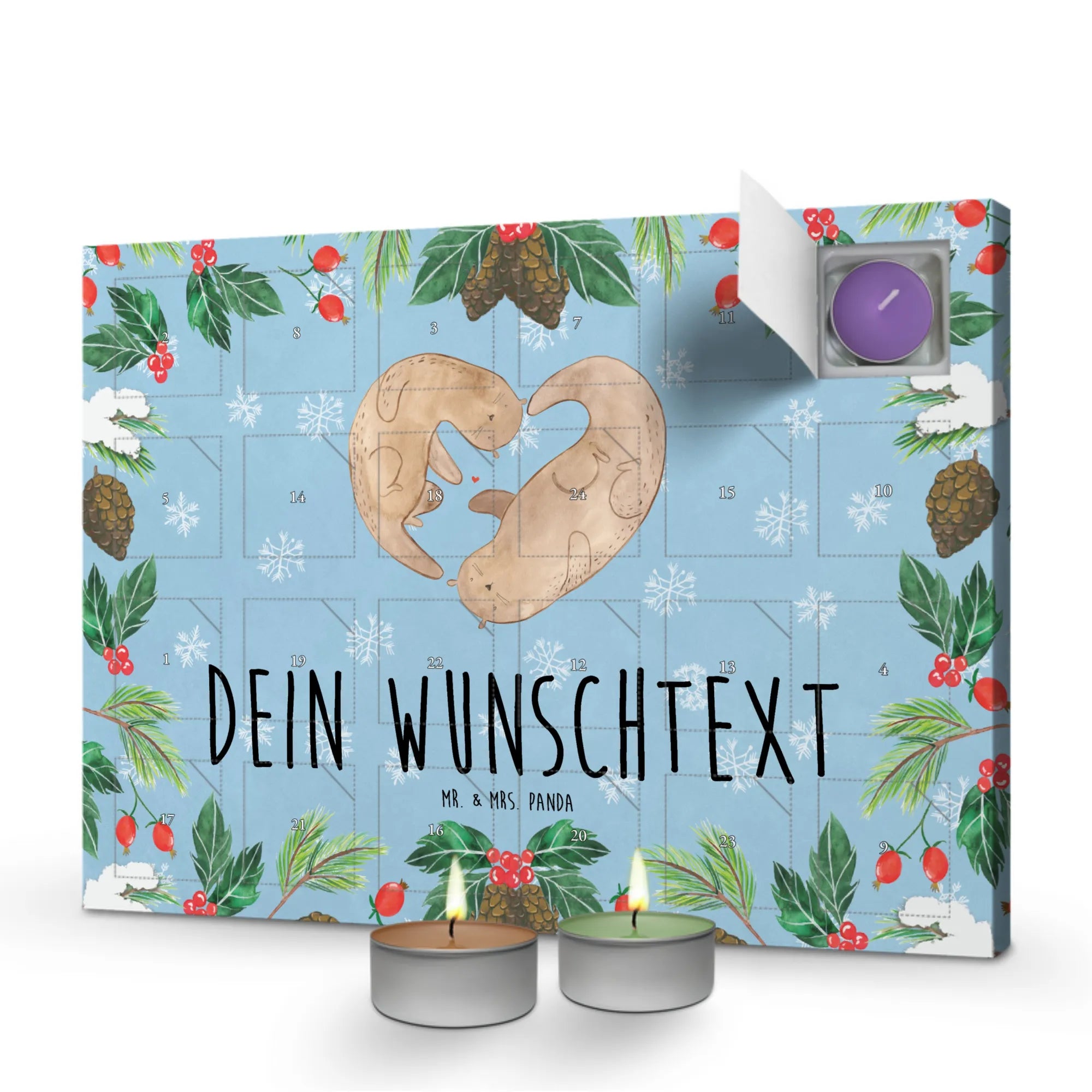 Der personalisierte Duftkerzen Adventskalender "Otter Valentine" von Mr. & Mrs. Panda ist das perfekte Geschenk für alle, die Liebe und Gemütlichkeit verbinden möchten. Mit liebevoll handgezeichneten Ottern, die sich an den Pfoten halten und ein Herz bilden, zaubert er jedem ein Lächeln ins Gesicht.