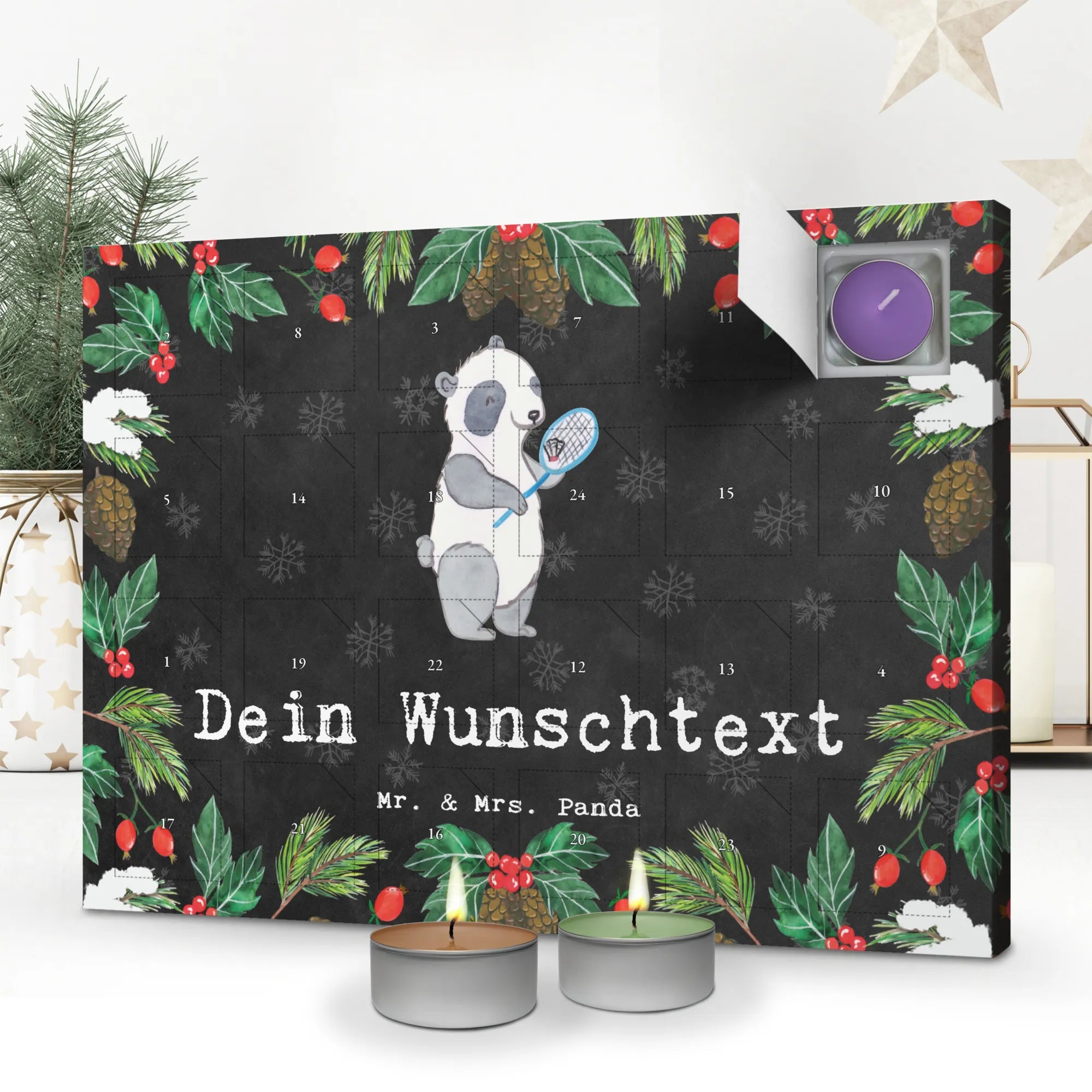 Personalisierter Duftkerzen Adventskalender Panda Badminton – Mr. & Mrs. Panda