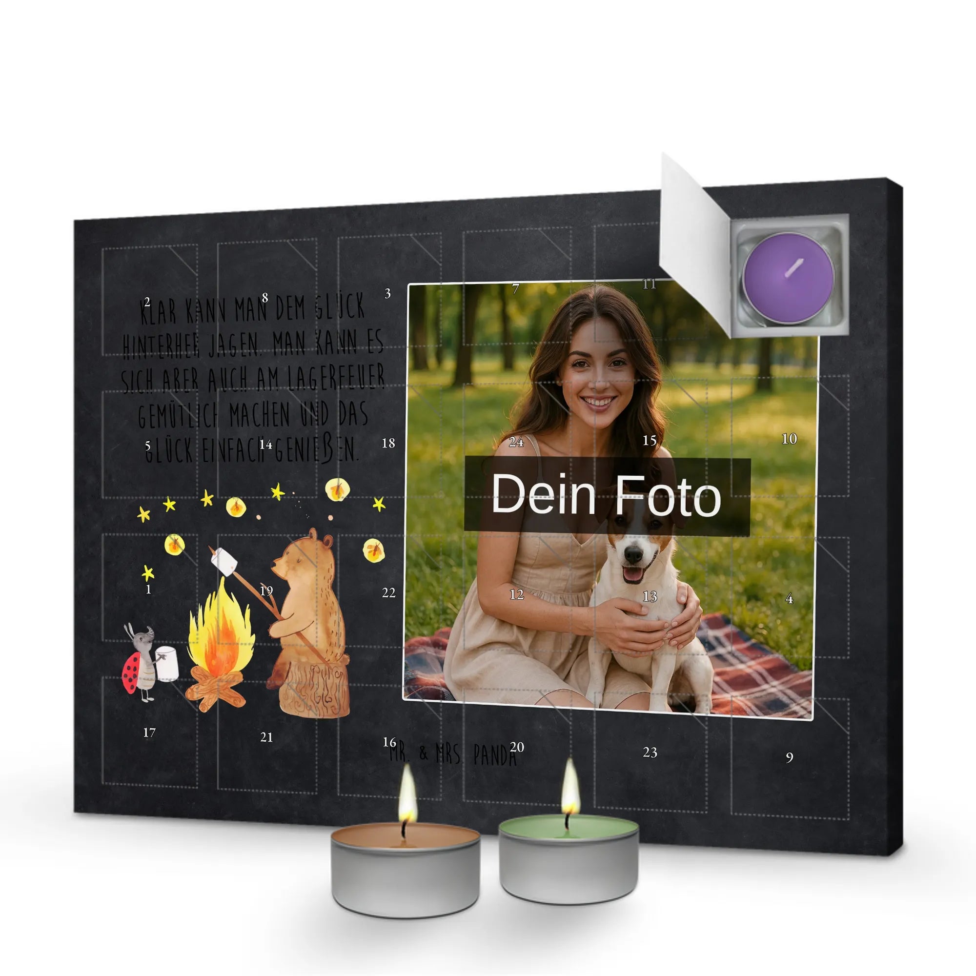 Personalisierter Duftkerzen Foto Adventskalender Bär & Marienkäfer Lagerfeuer - Kreidetafel